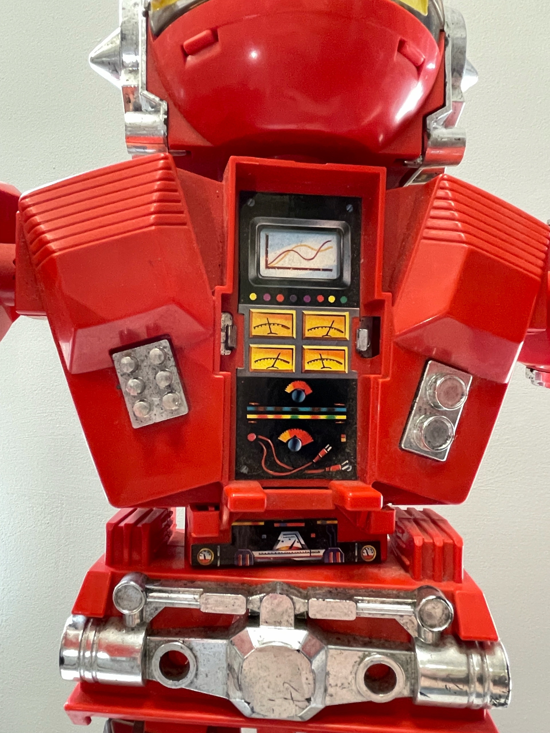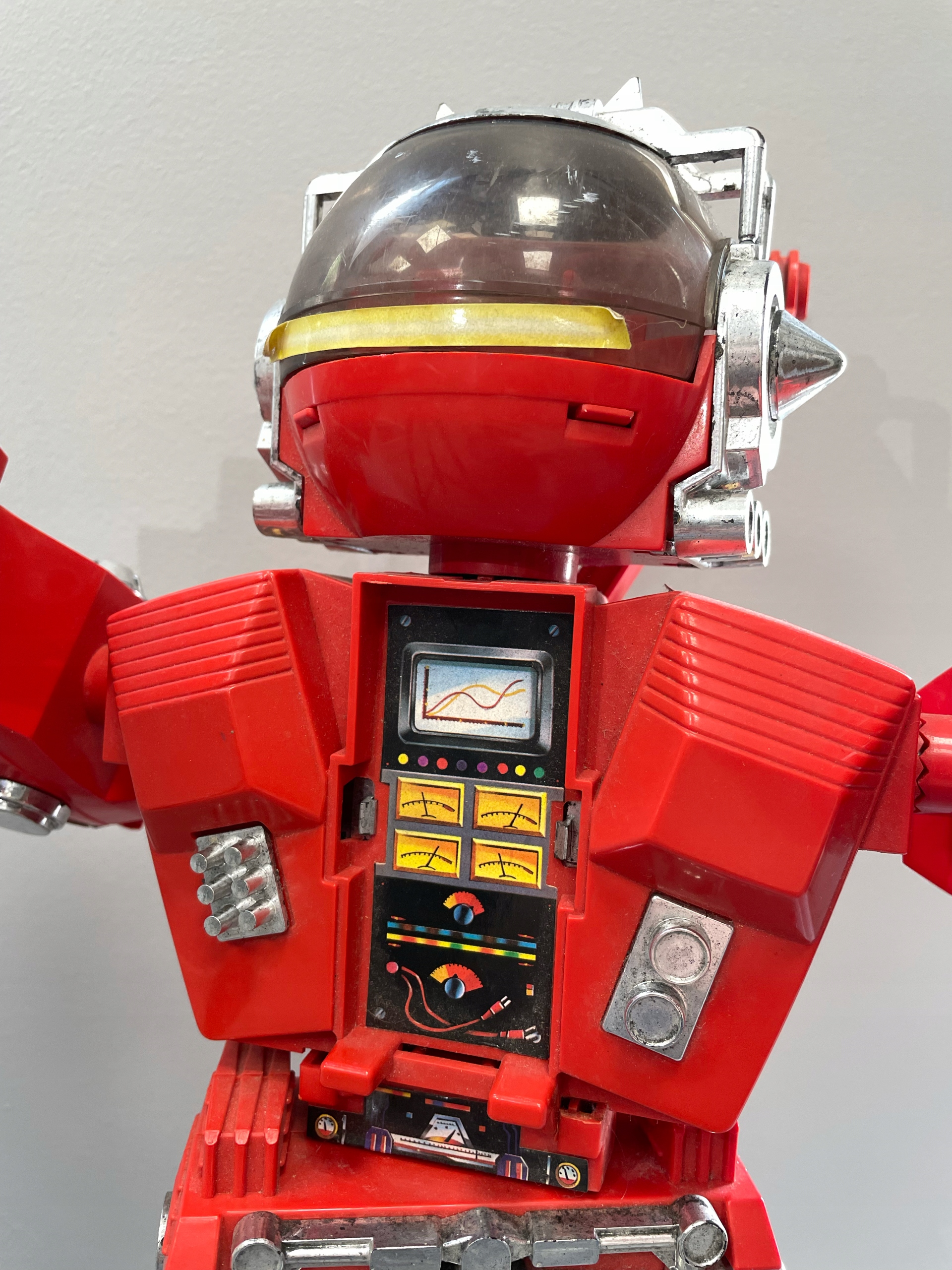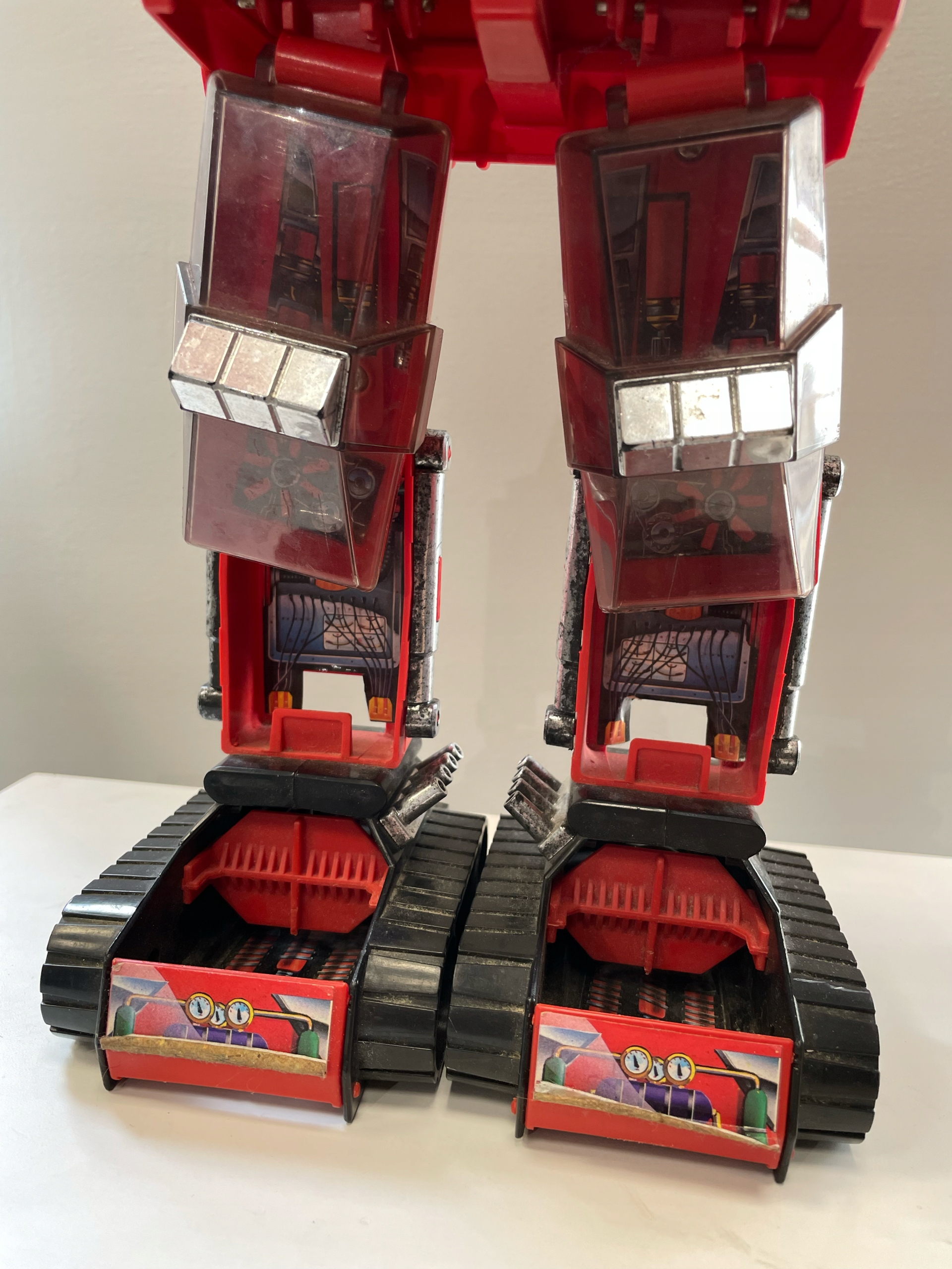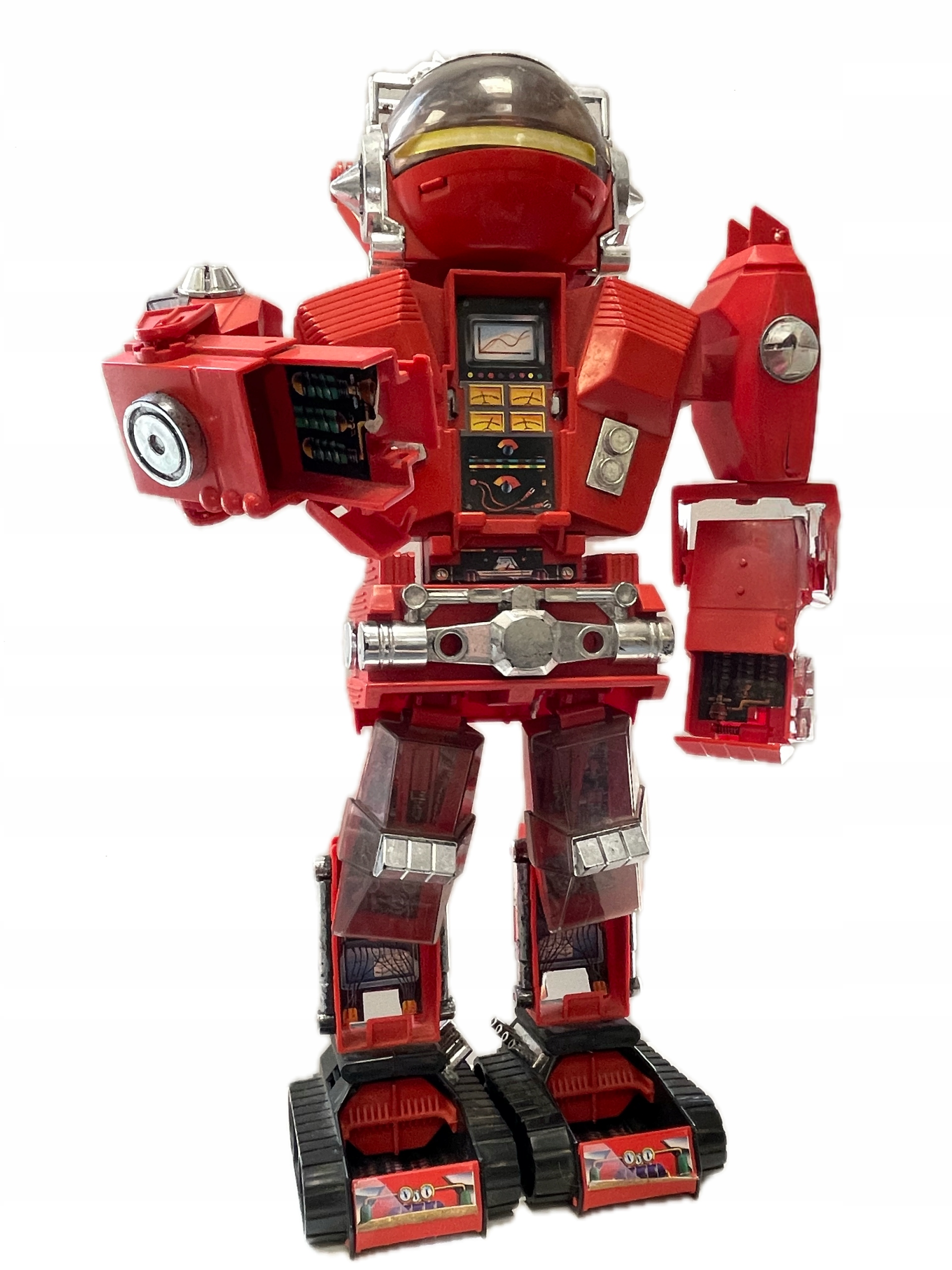 Ця незвичайна пружина - Carangantua - величезний транспортний робот із серії матчів 80 -х років, який дивує як розміри, так і функціональність. Зроблено в основному з червоного пластику, збагаченого прозорими кабінами, хромованими деталями та барвистими наклейками, що зображують контрольні настільні комп’ютери. Голова робота схована під куполом з видошукачем, а на руках є прозорі камери, що містять менші транспортні засоби - включаючи оригінальну модель жовтого сірникового коробки. У броні є вступні розділи, що розкривають деталі "механізму", що ще більше зміцнює ефект футуристичного робота з 1980 -х. Незважаючи на те, що іграшка має видимі ознаки використання, її незвичайна форма та деталі дизайну змушують її залишатися цінним об’єктом серед колекціонерів ретро-збору. Ця весна, безумовно, виділяється у кожній колекції.