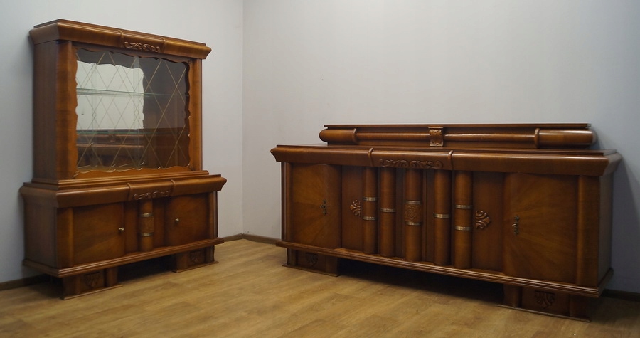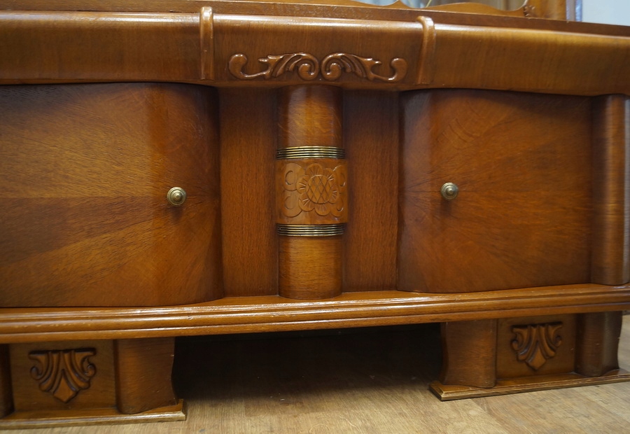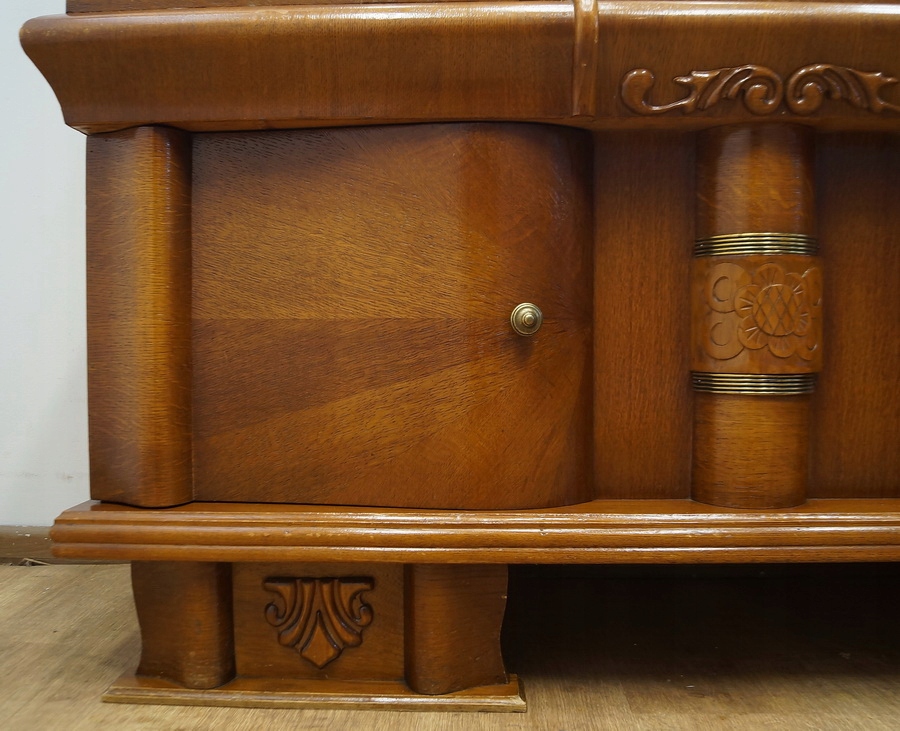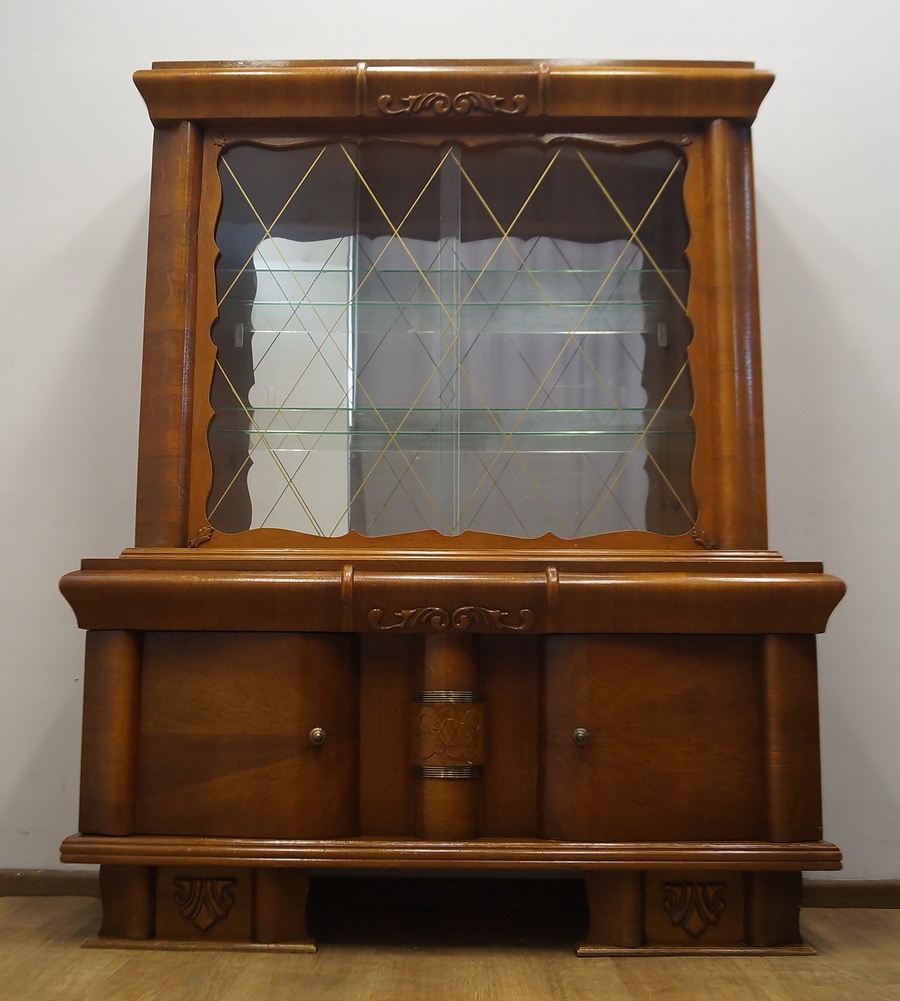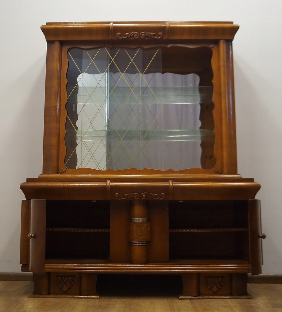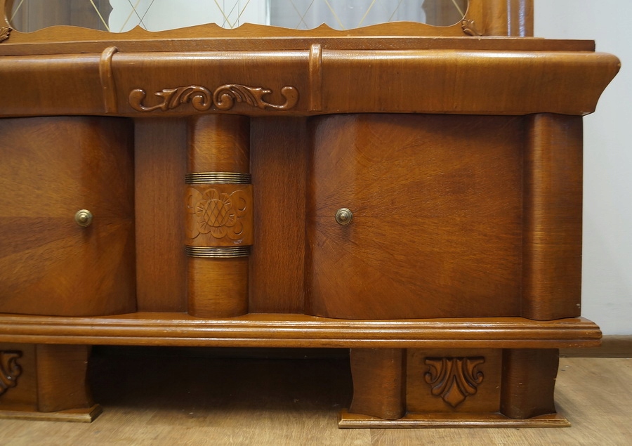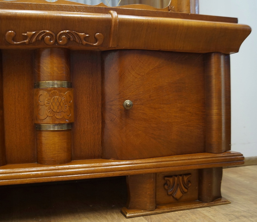 Верхня частина засклена і закрита двома розсувними стеклами панелі. Двоє нижніх дверей гарно оформлені та мають унікальну форму. Красиві елементи роблять цей предмет меблів унікальним і особливим.