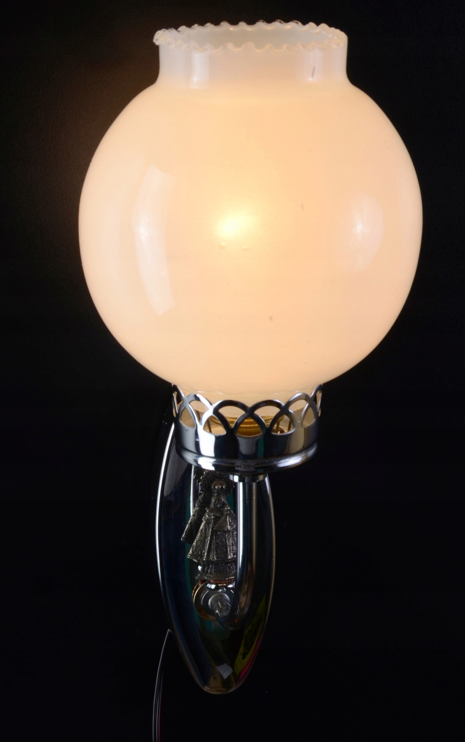 Він виготовлений зі сріблястого металу. Настінний світильник має декор, що прикрашає стінну частину. На особливу увагу заслуговує абажур настінного світильника - це куля з міцного білого скла з витонченою ніжною оборкою.