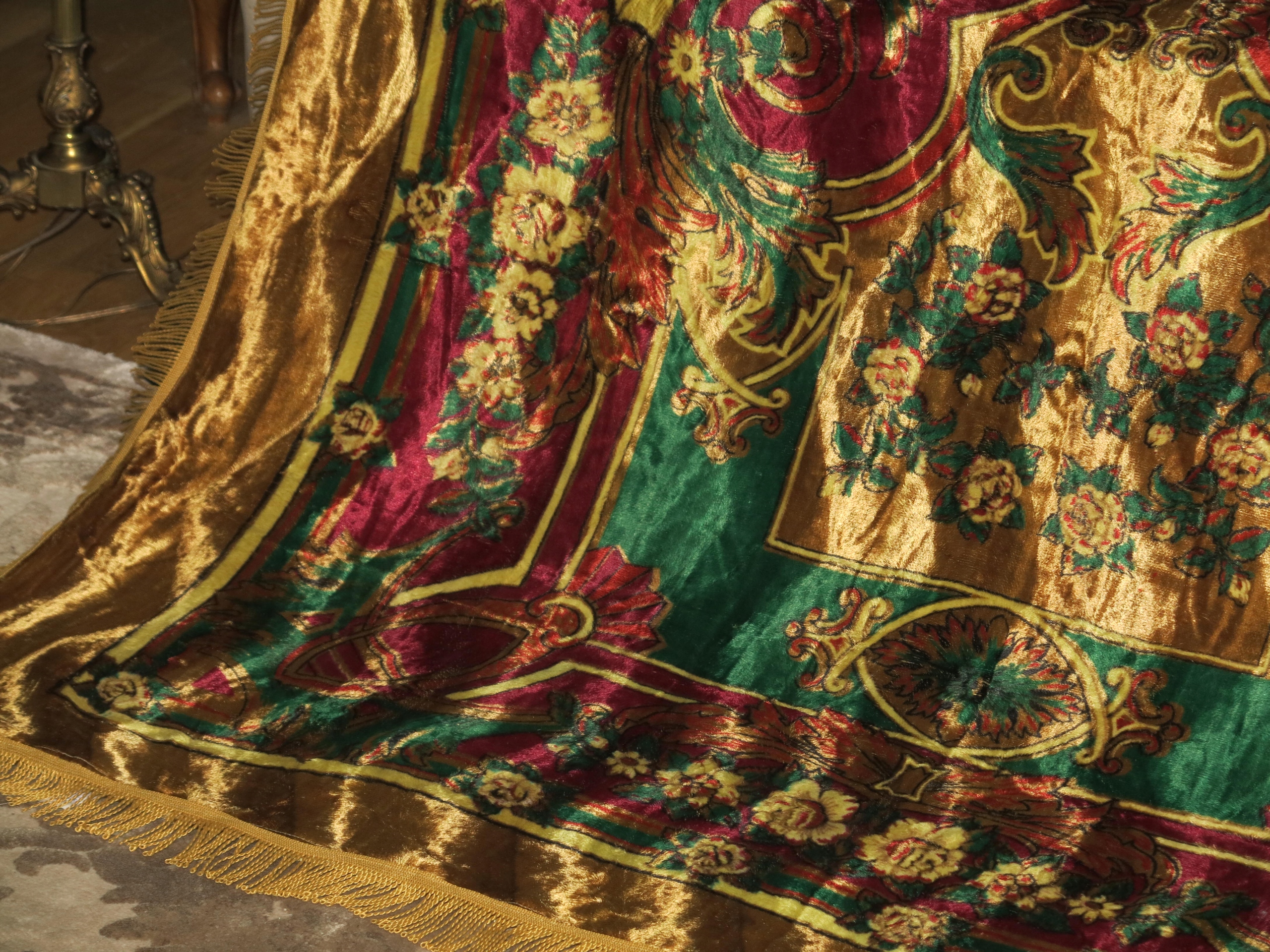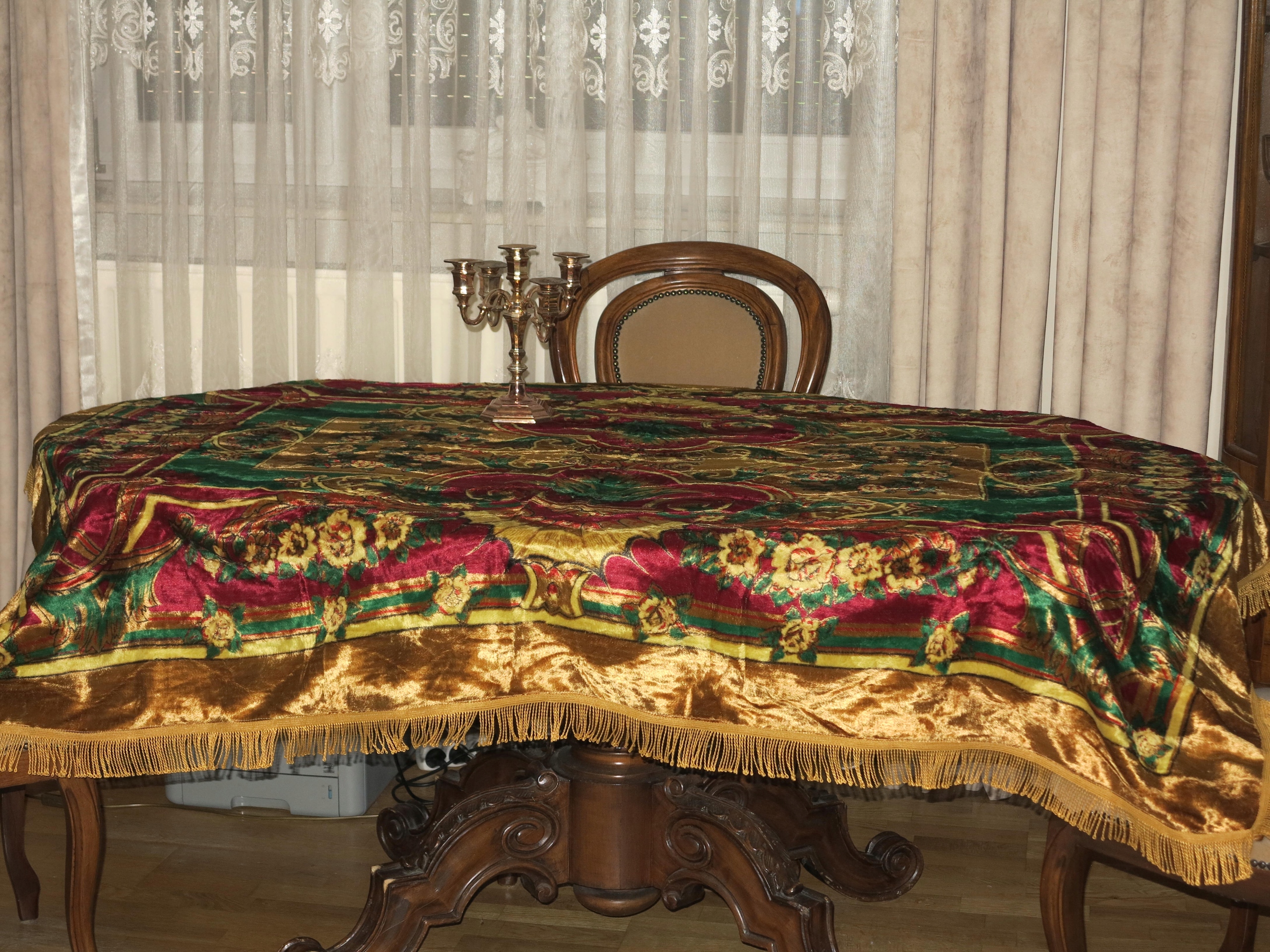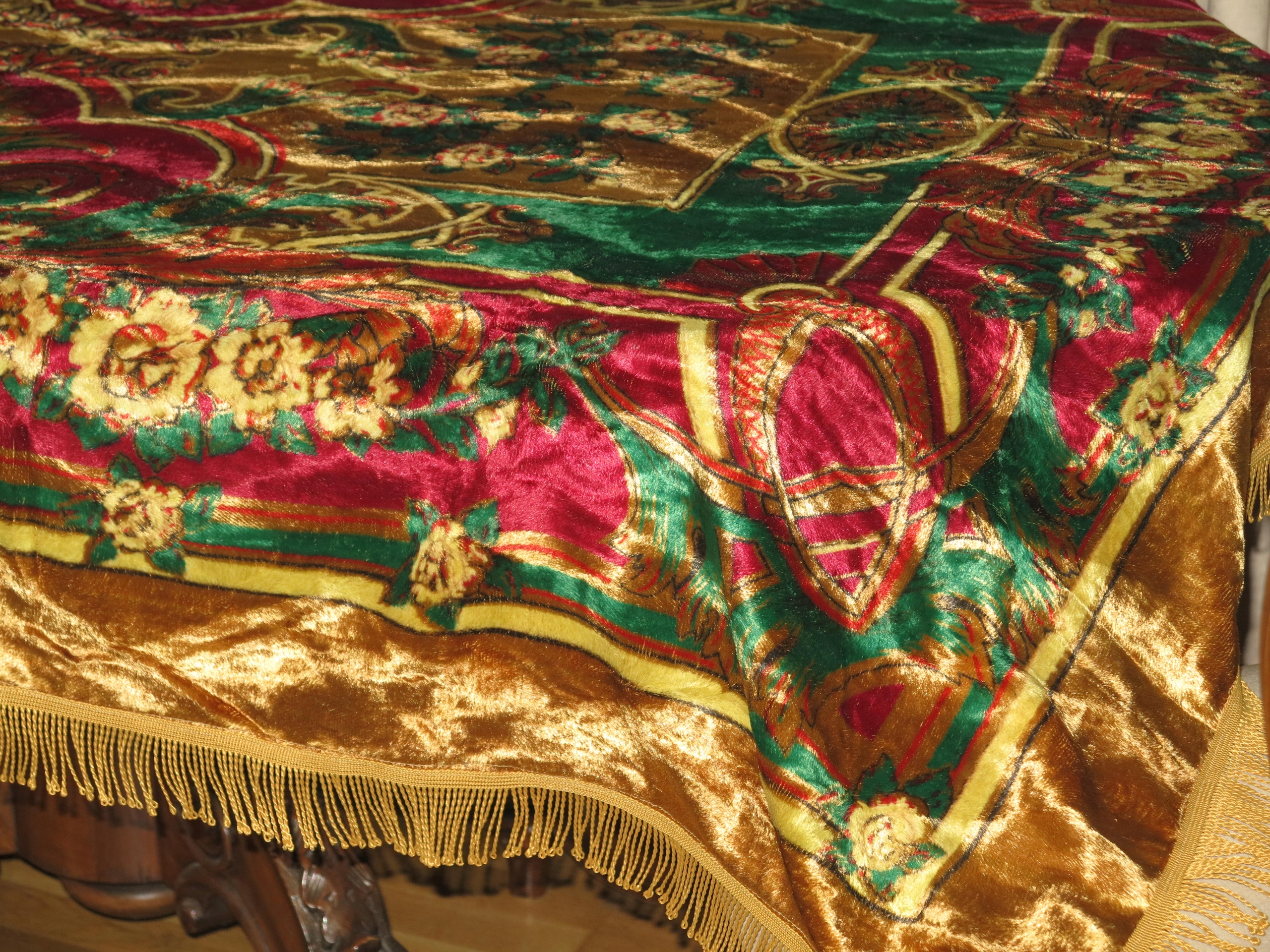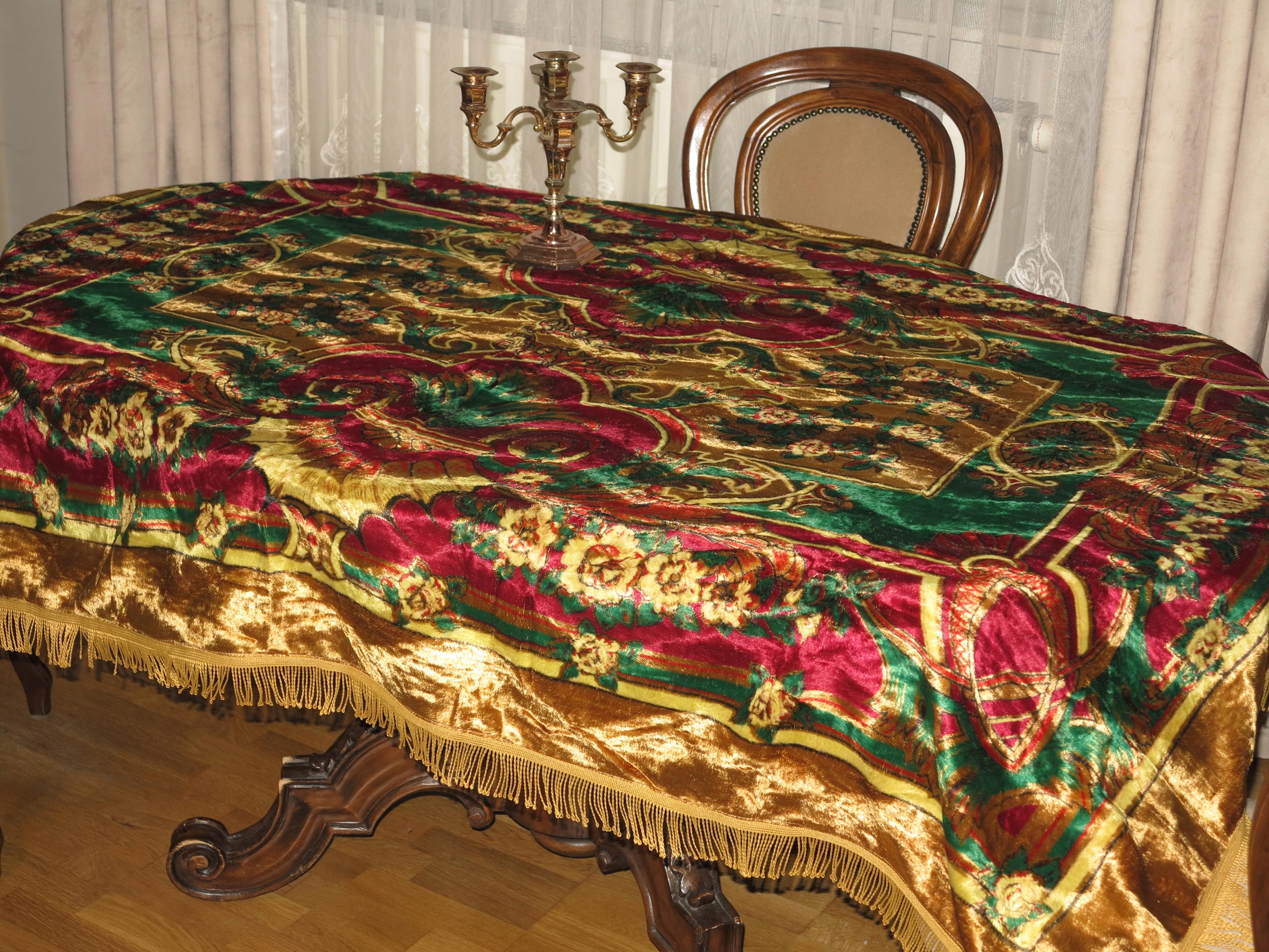 Предмет аукціону – унікальна стильна скатертина або килим у стилі модерн з благородної оксамитової бавовни з бахромою навколо. Скатертина має розміри: 188/138 см плюс бахрома приблизно 5 см. Скатертина б/у, але в дуже хорошому стані та якості, незважаючи на вік. Він прослужить багато років. Рекомендую - для справжнього знавця.