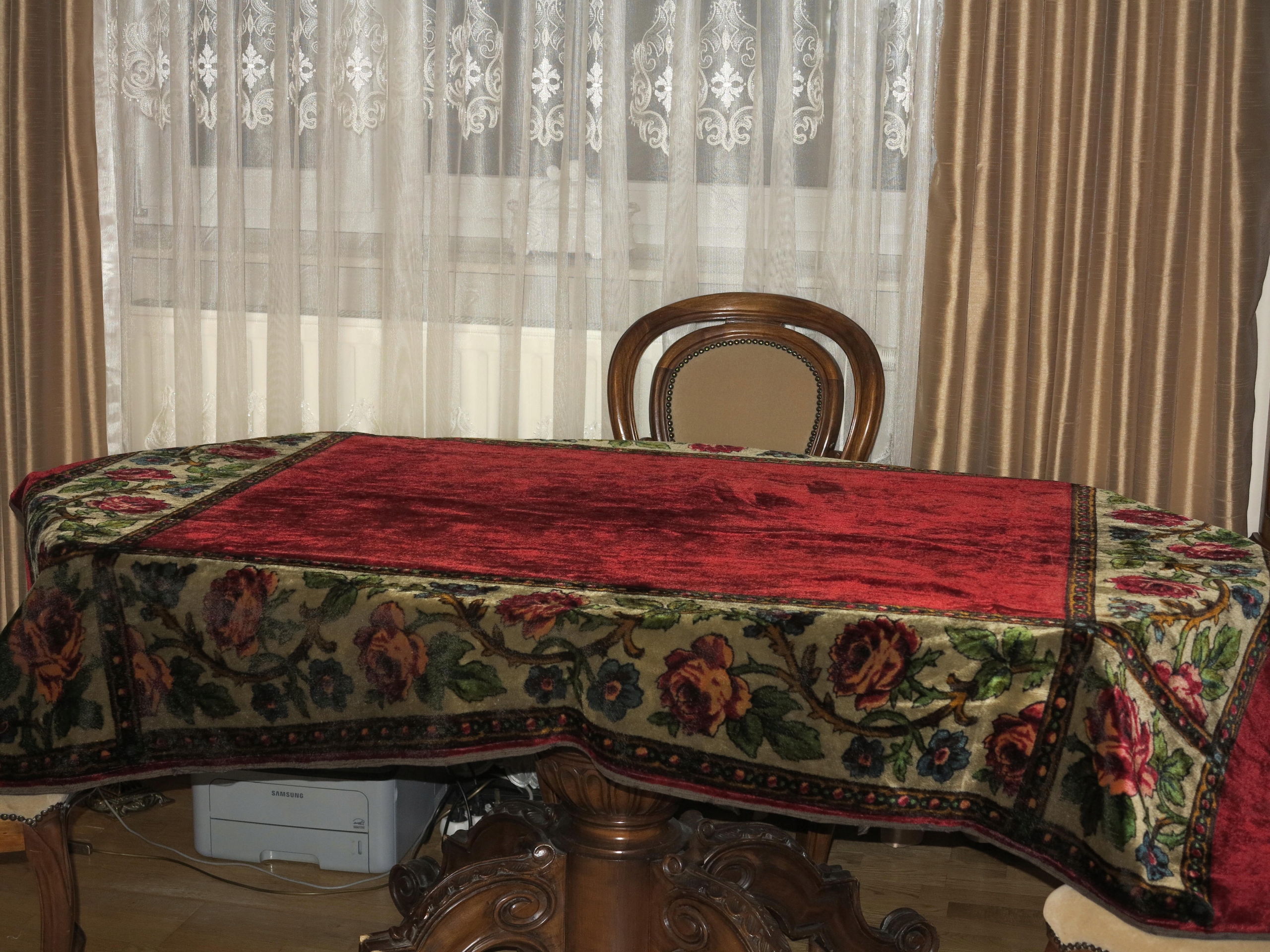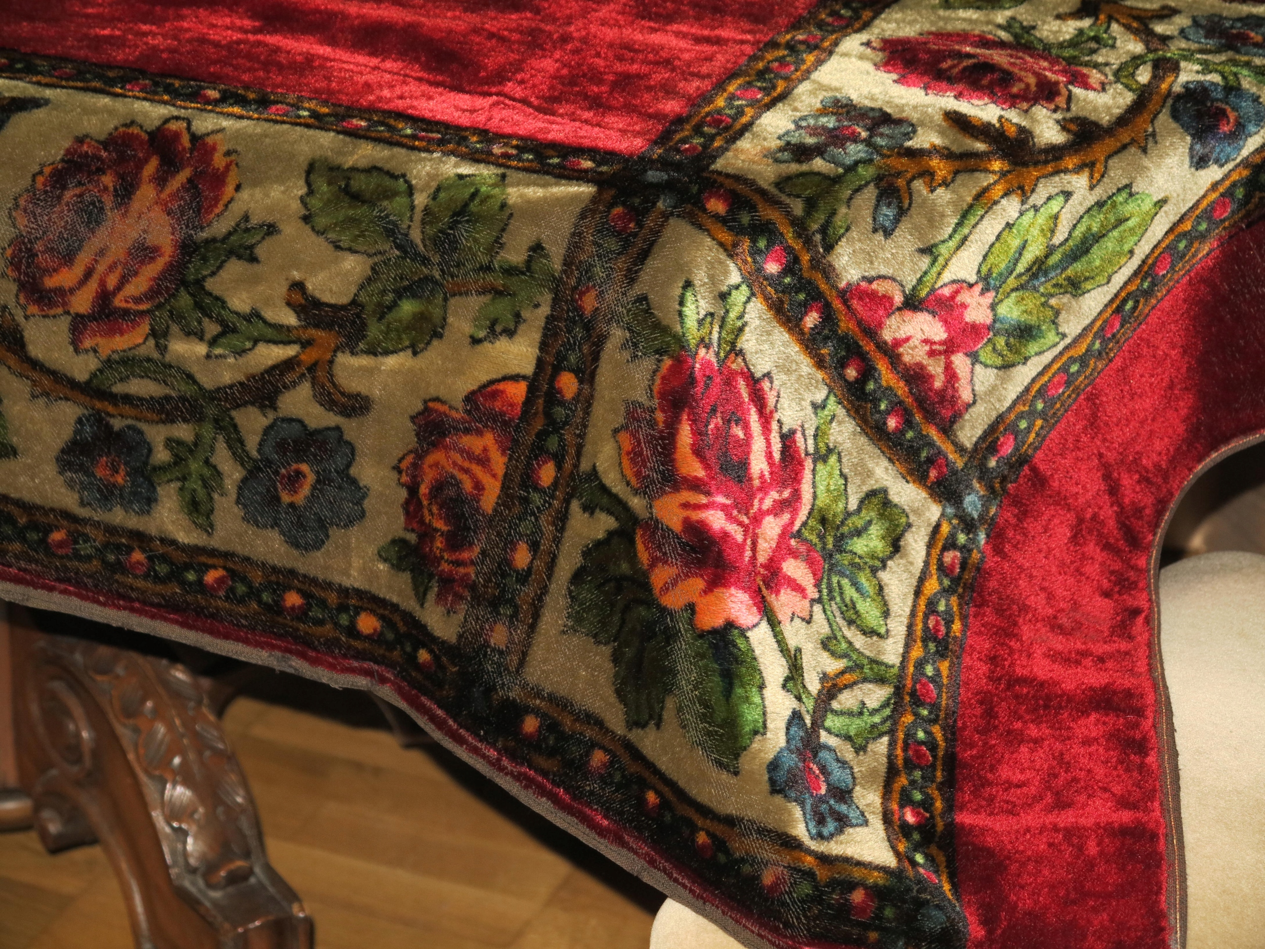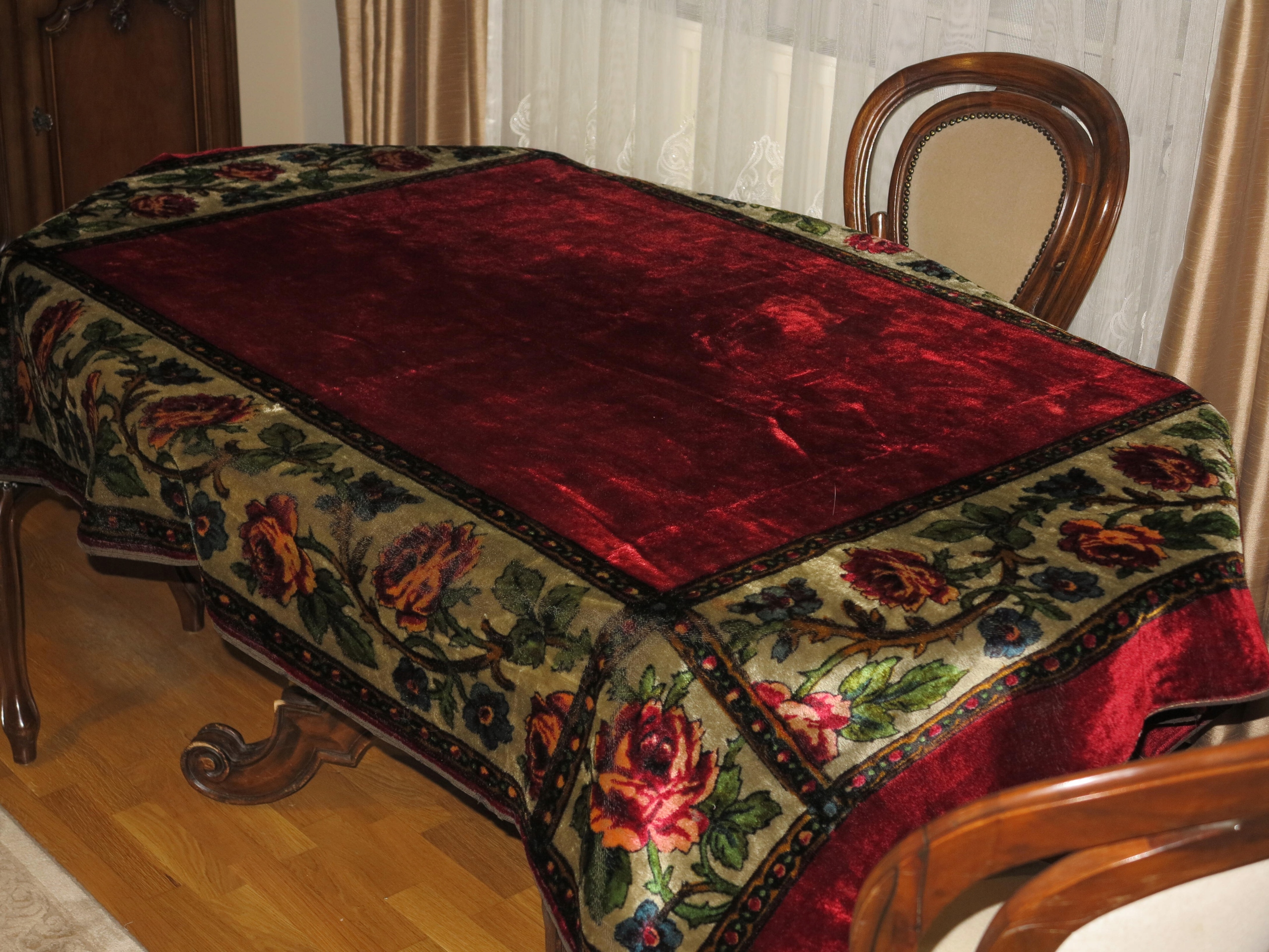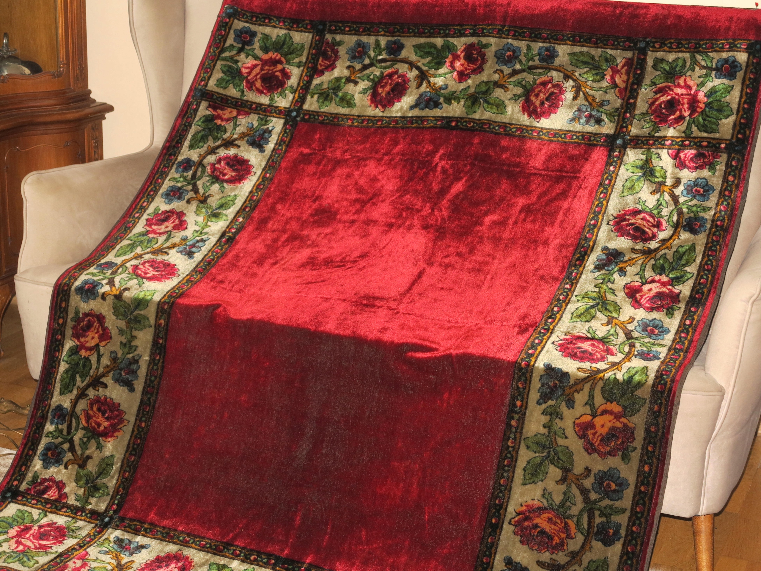 Предмет аукціону - унікальний, антикварний, приблизно 100-річна скатертина-килим-покривало з плюшевого оксамиту в красивих кольорах і візерунках. Має розміри: 195/144 см. Скатертина б/в, в дуже хорошому стані з невеликими недоліками для такої старої скатертини.