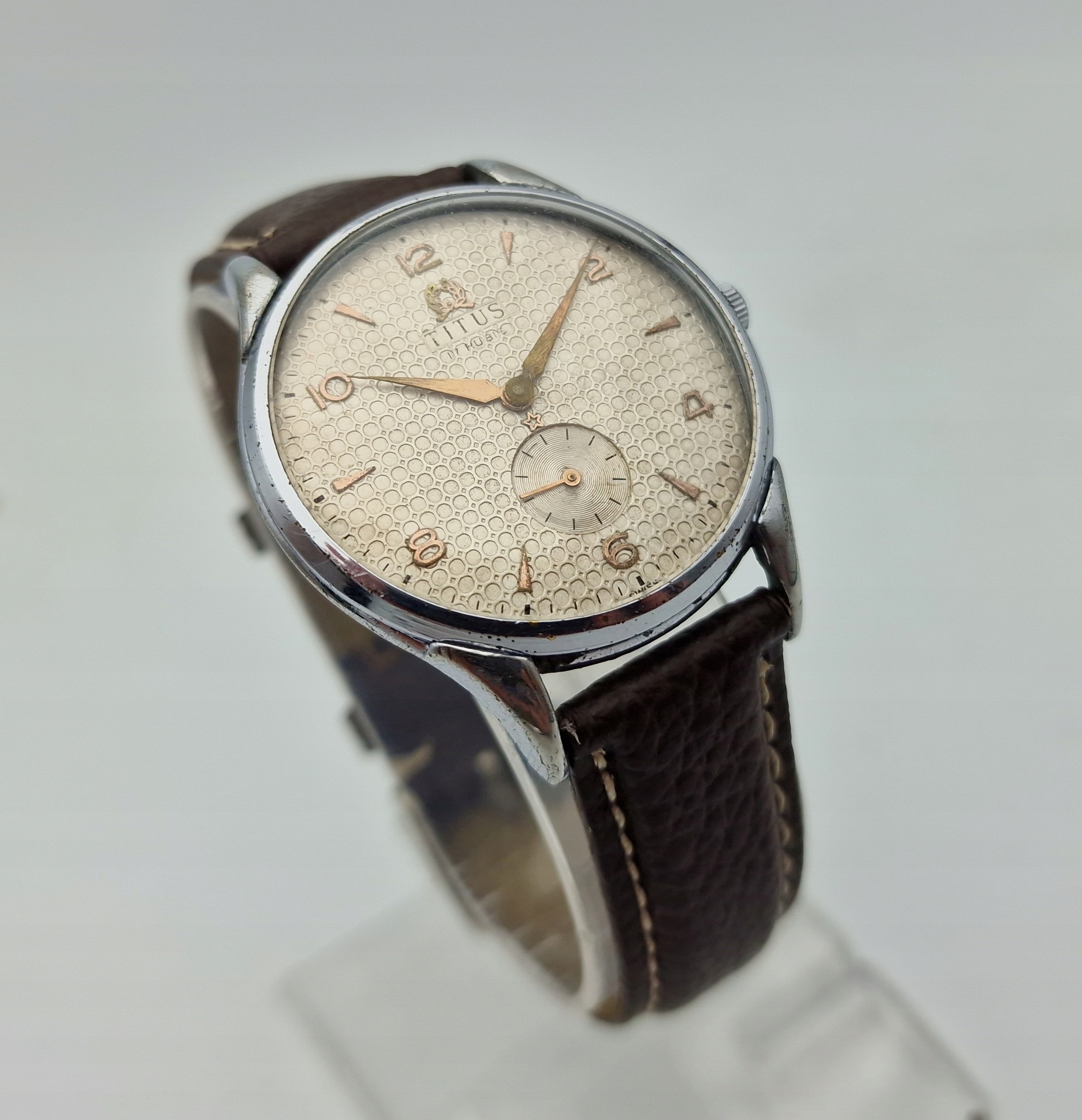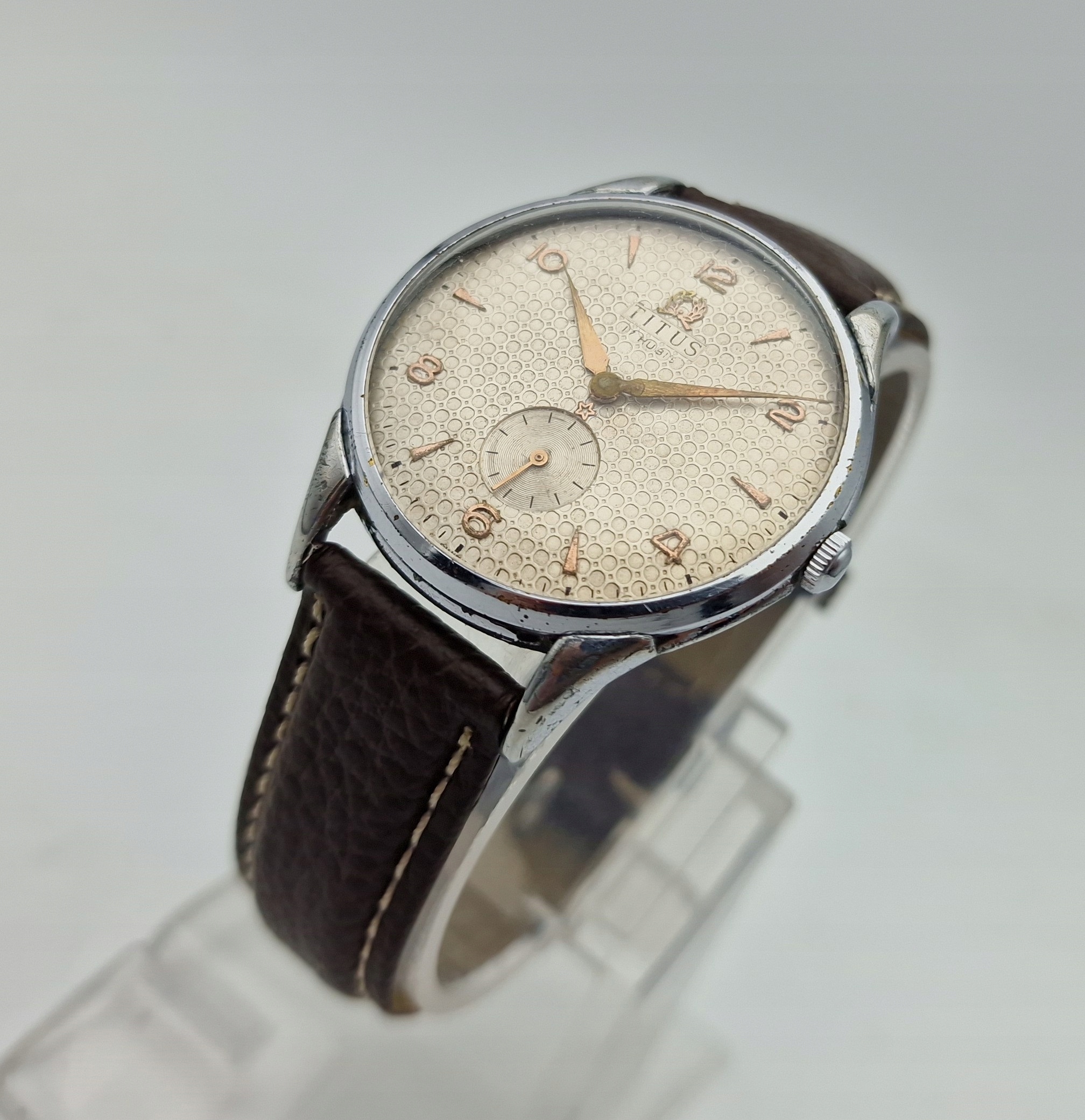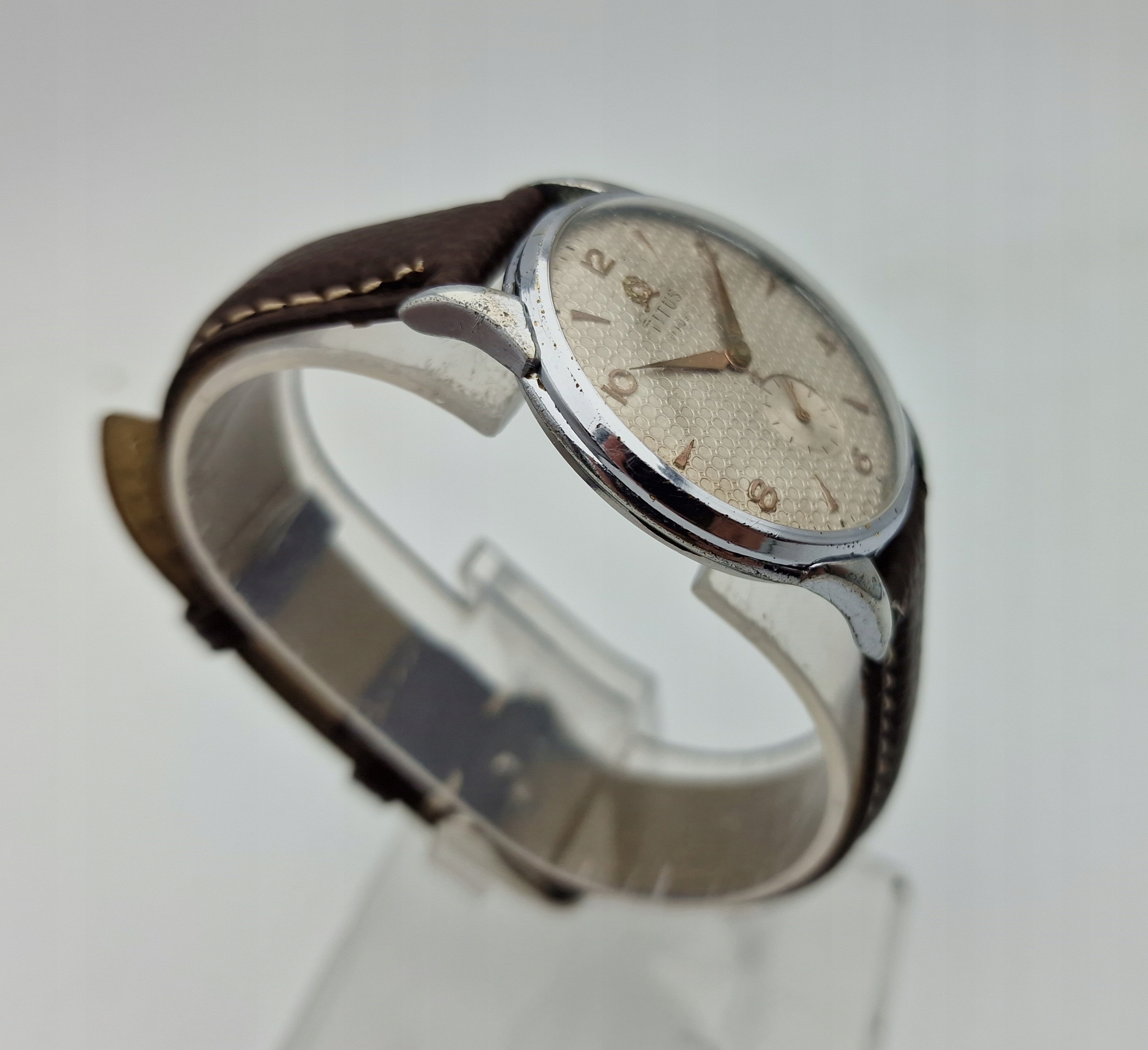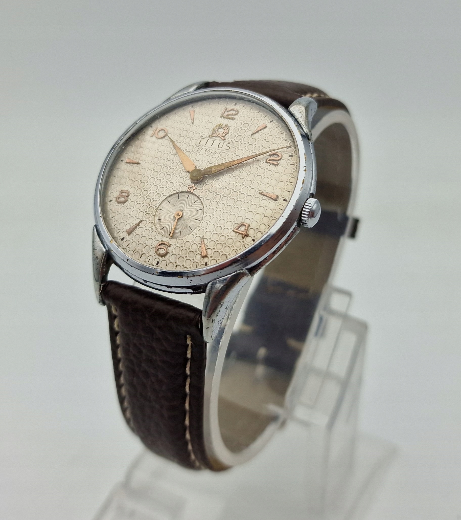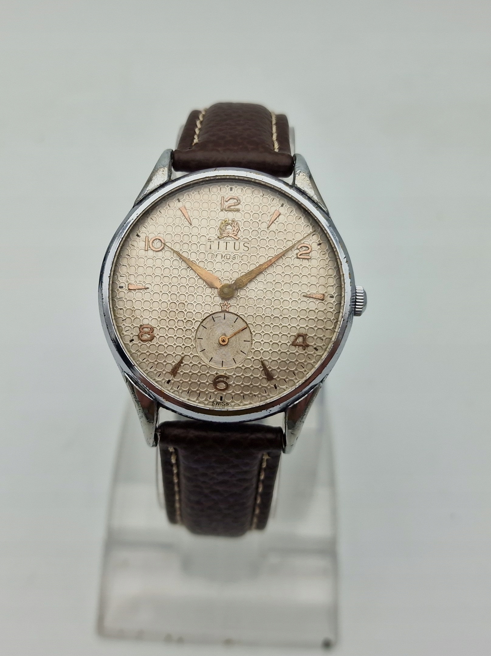 - Срібний металевий циферблат з окремою секундною стрілкою на шостій годині. Циферблат підписаний: «TITUS, 17 RUBIS, SWISS». Циферблат майже в ідеальному стані, враховуючи свій вік, вкритий природною патиною часу.