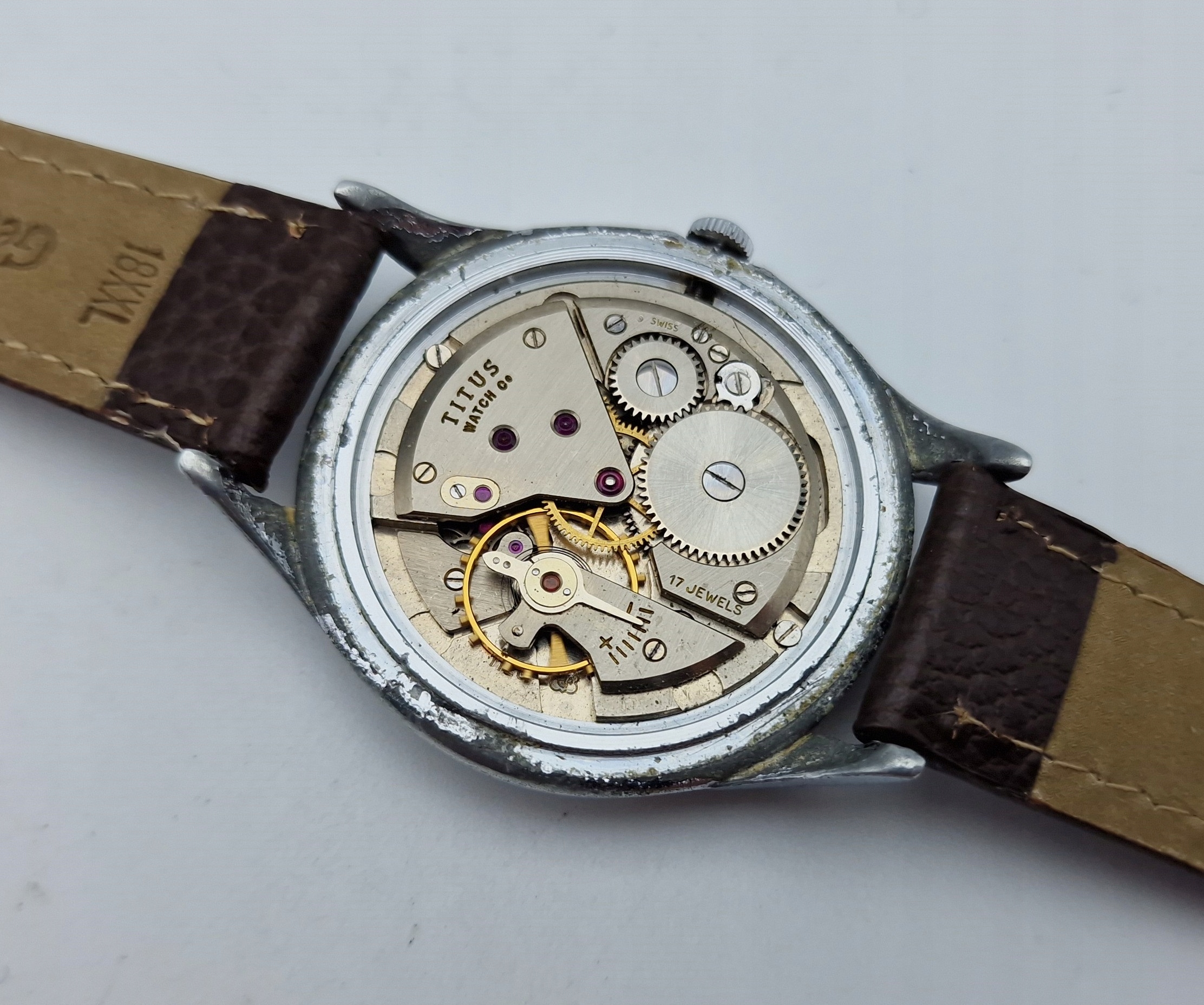 - Годинниковий механізм із 17 дорогоцінними каменями та анкерним спуском, підпис: «TITUS WATCH CO, SWISS, 17 JEWELS» у хорошому та точному робочому стані після огляду та обслуговування годинникарем.