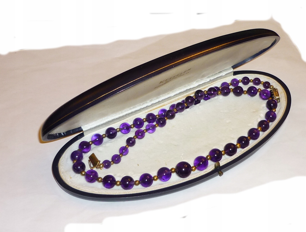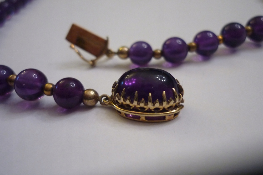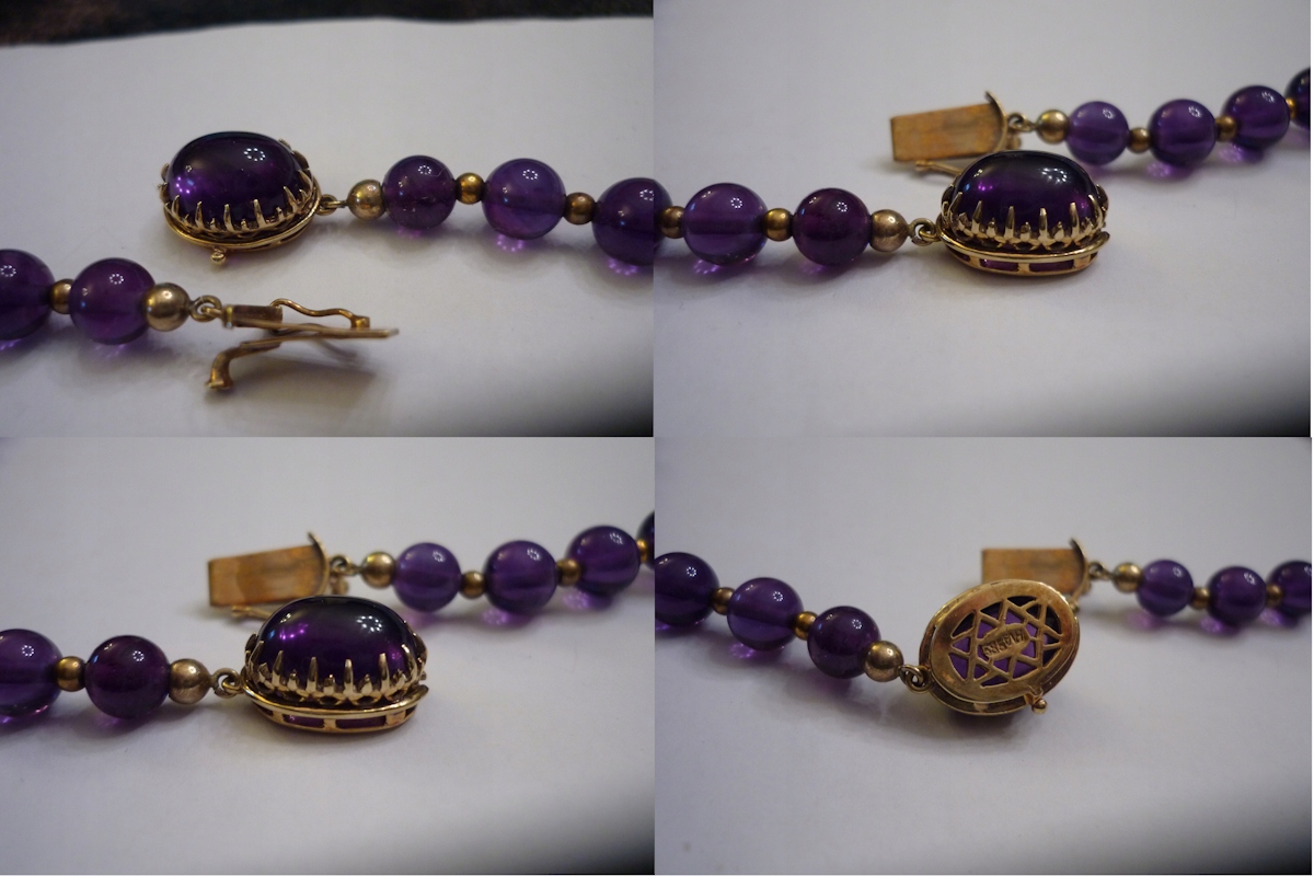 Кольє виготовлено методом золота 585 проби - підпис на застібці. Прикраса - Аметисти красивого, насиченого кольору, переплетені з золотими кульками. Розміри аметистів 7 - 12,8 мм - загальна вага приблизно 160 карат. Аметист в застібці 13 х 10 мм - приблизно 3,5 карата. Довжина намиста 61 см. Вага 65900 грам. Аукціон проводиться за весь лот. Стан як на фото.