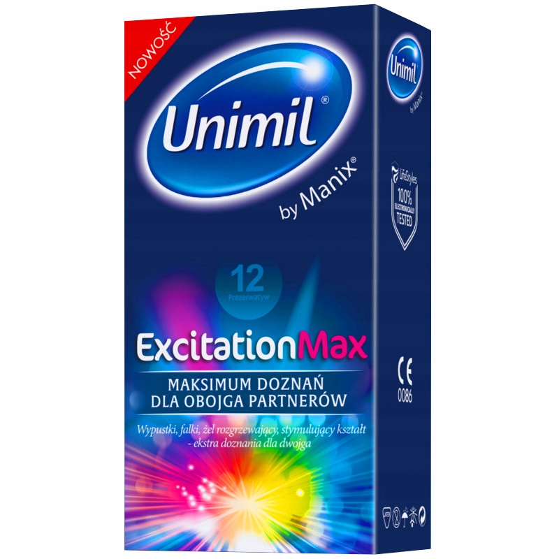 Ідеально підходить для анального сексу. Презервативи Unimil Excitation Max забезпечують максимум відчуттів для обох партнерів. Унікальна форма і текстура у верхній частині подарують йому нові, надзвичайні відчуття, а виступи стануть додатковим джерелом задоволення для неї. Зігріваючий гель - це одночасна стимуляція, яка дозволяє досягти повного задоволення від статевого акту. Excitation Max - це унікальні презервативи, завдяки яким ви разом відкриєте новий вимір насолоди.