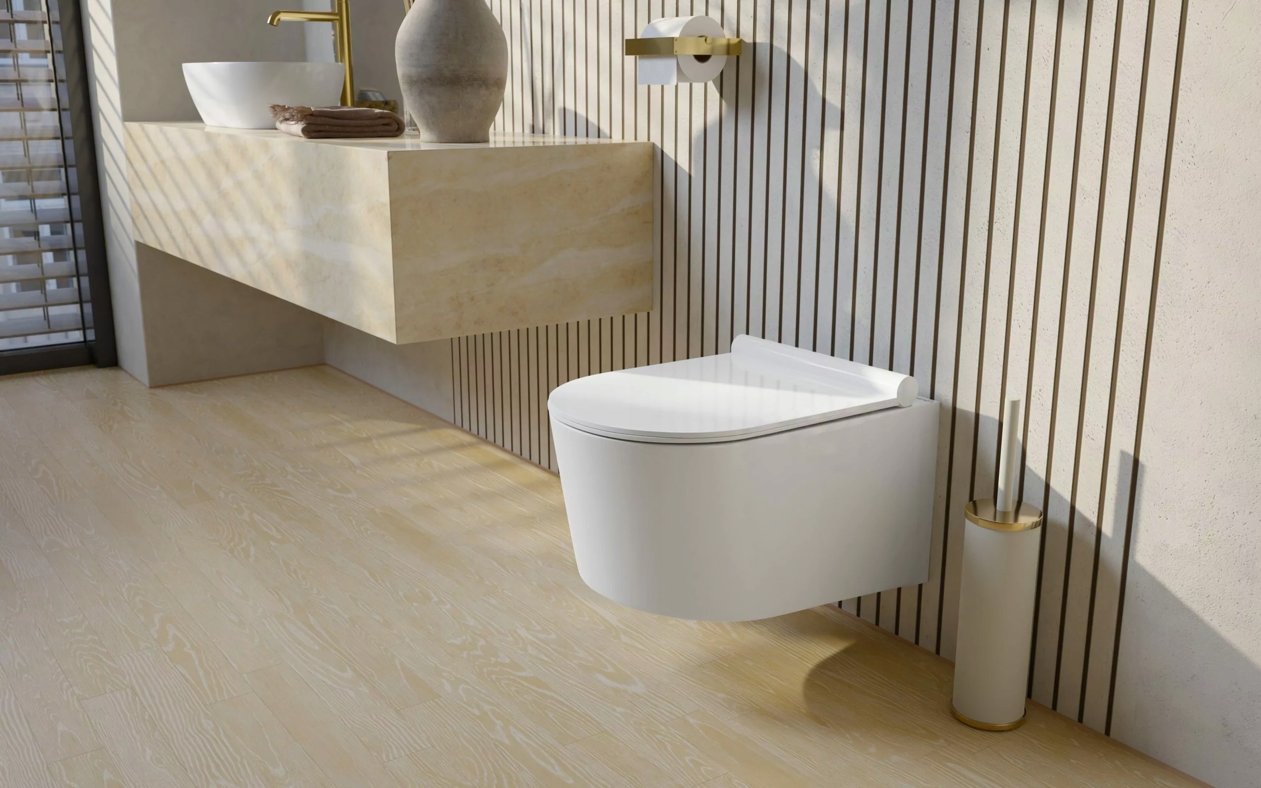 Підвісний унітаз без оправи з сидінням унітазу, що повільно опускається.