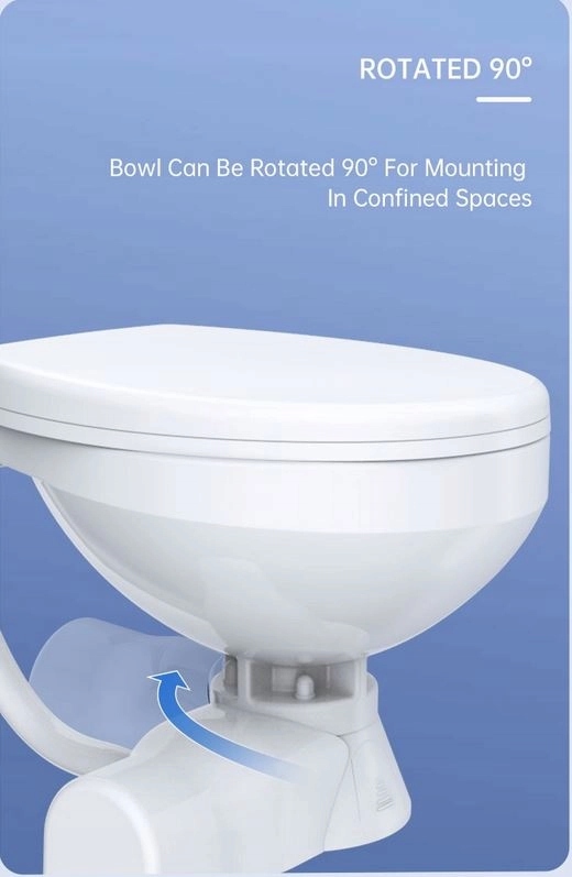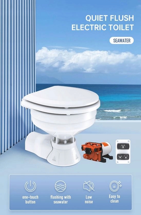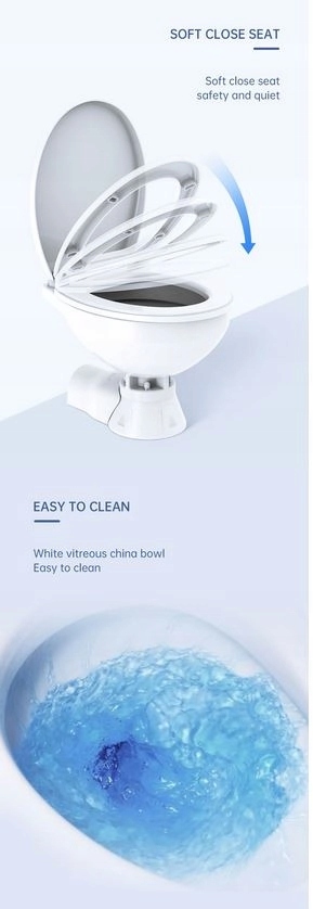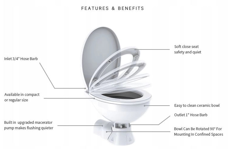 Докладні розміри на схемі. Дуже тихий цикл змиву, як у домашньому туалеті. Однокнопковий привід змиву з двофункціональним перемикачем рівня води. У комплекті з насосом SEAFLO для промивання морською або озерною водою. Чаша з білої склоподібної порцеляни.