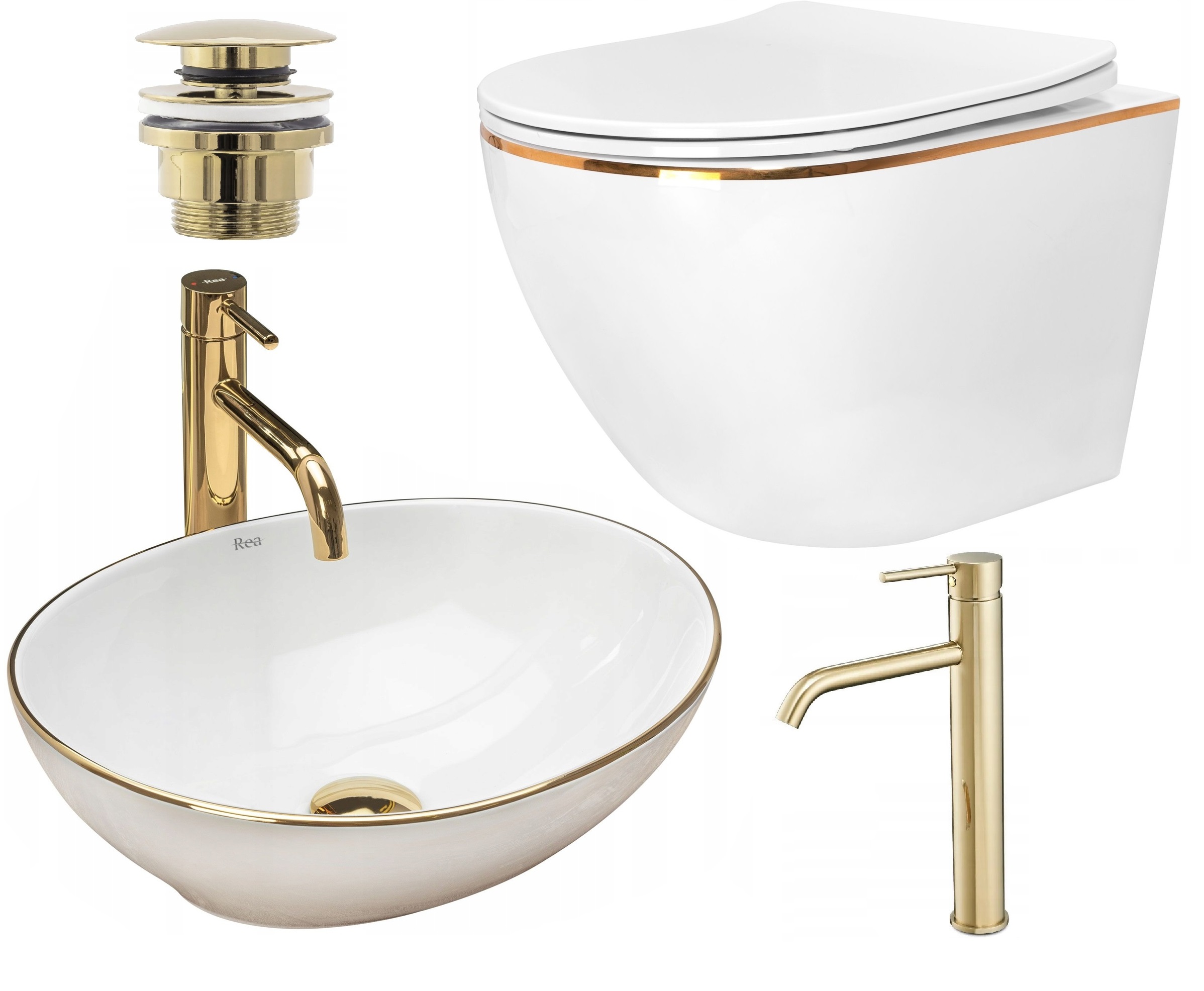 Унітаз Rea, золотий обідок + умивальник, золотистий обідок + золотий кран + золота заглушка