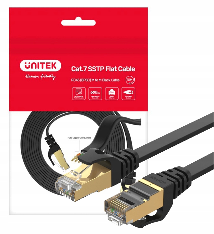 Максимальна пропускна здатність кабелю становить 10 Гбіт/с на частоті 500 МГц, що дозволяє повністю використовувати можливості поточних мережевих пристроїв і водночас забезпечує пропускну здатність на майбутнє, коли технологія розвиватиметься далі. У пропозиції Unitek є плоскі патч-корди Cat. 7 довжина 1 м; 2 м; 3 м; 5 м; 10 м; 15 метрів і 20 метрів. Мережевий кабель Cat 7 плоский – найкраща інвестиція, якщо ви встановлюєте його під підлогою або в іншому важкодоступному місці під час ремонту/будівництва.