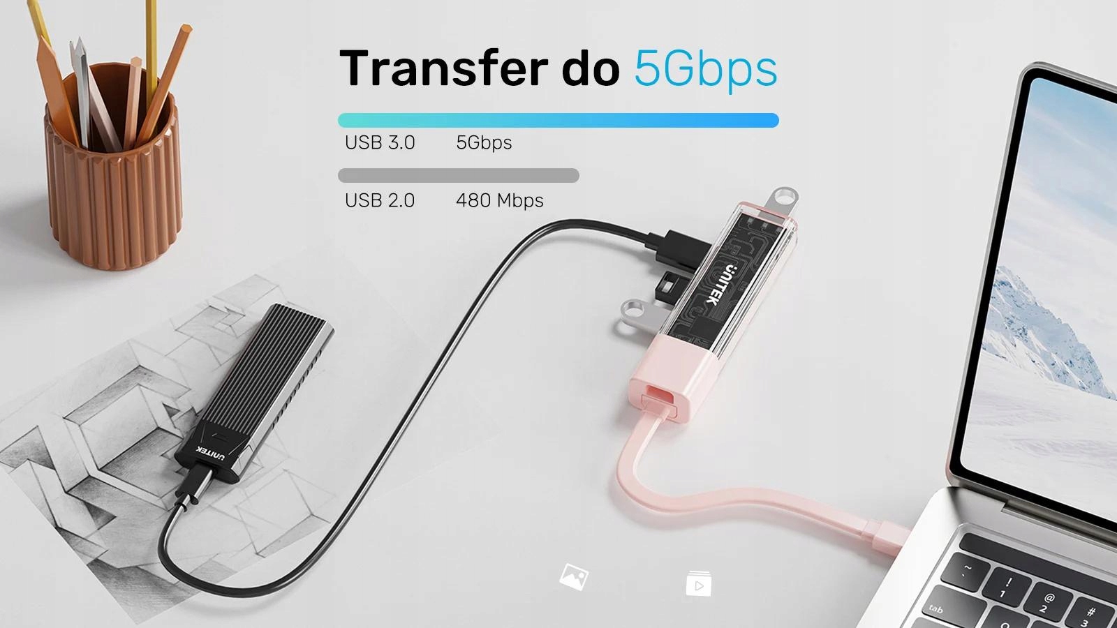 Unitek hub dwukierunkowy USB C/USB A 5Gbps, 4x USB A różowy