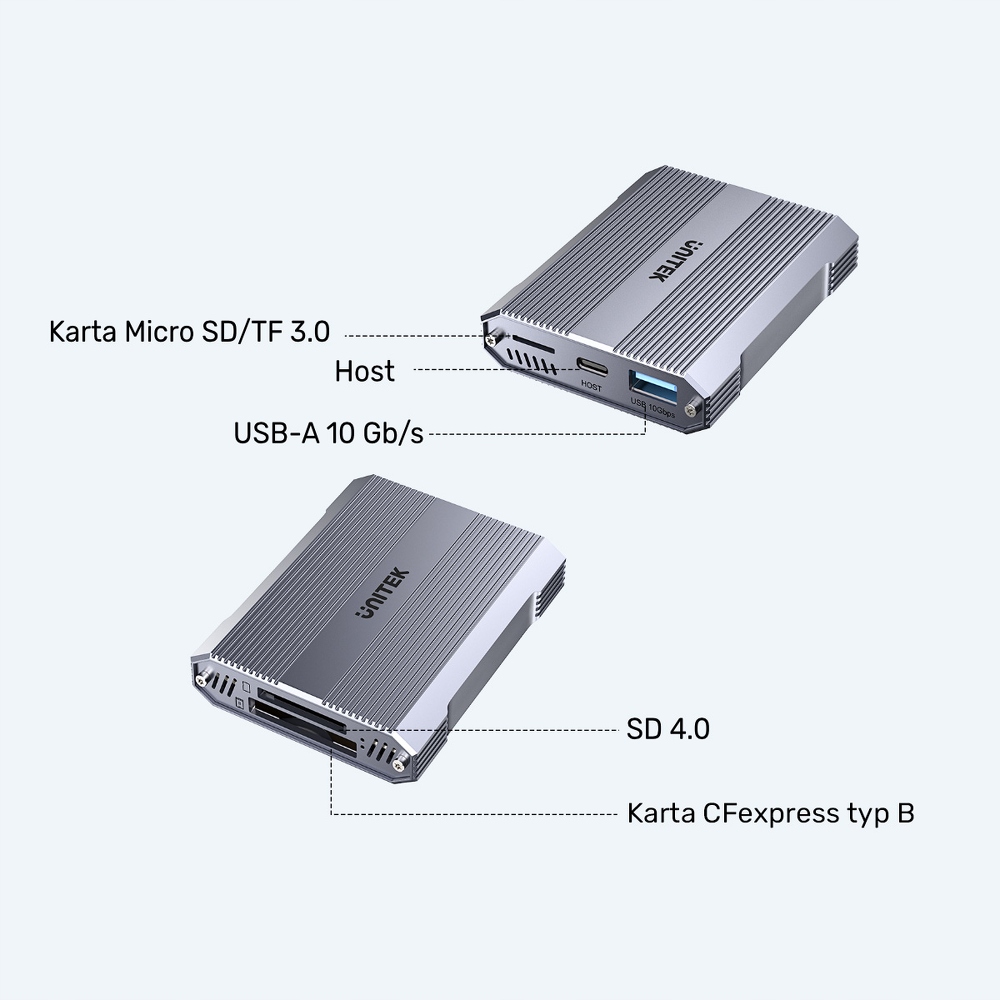 4 Unitek R1022C01 - це зчитувач карт пам'яті з слотами до кожного з цих типів цих носіїв даних та з додатковою розеткою USB з пропускною здатністю 10 ГБ/с.