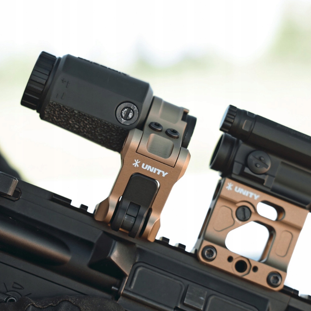 Встановлення збільшувача, що забезпечує швидкий перехід між коліматором і збільшувачем по вертикальній лінії. Механізм FTC утримує збільшувач на одній лінії під оптичною віссю в складеному стані, усуваючи бічний нахил і ризик зачеплення за одяг або обладнання. Монтажна висота 57 мм дозволяє швидко перемикати приціли без зміни висоти прицілу.