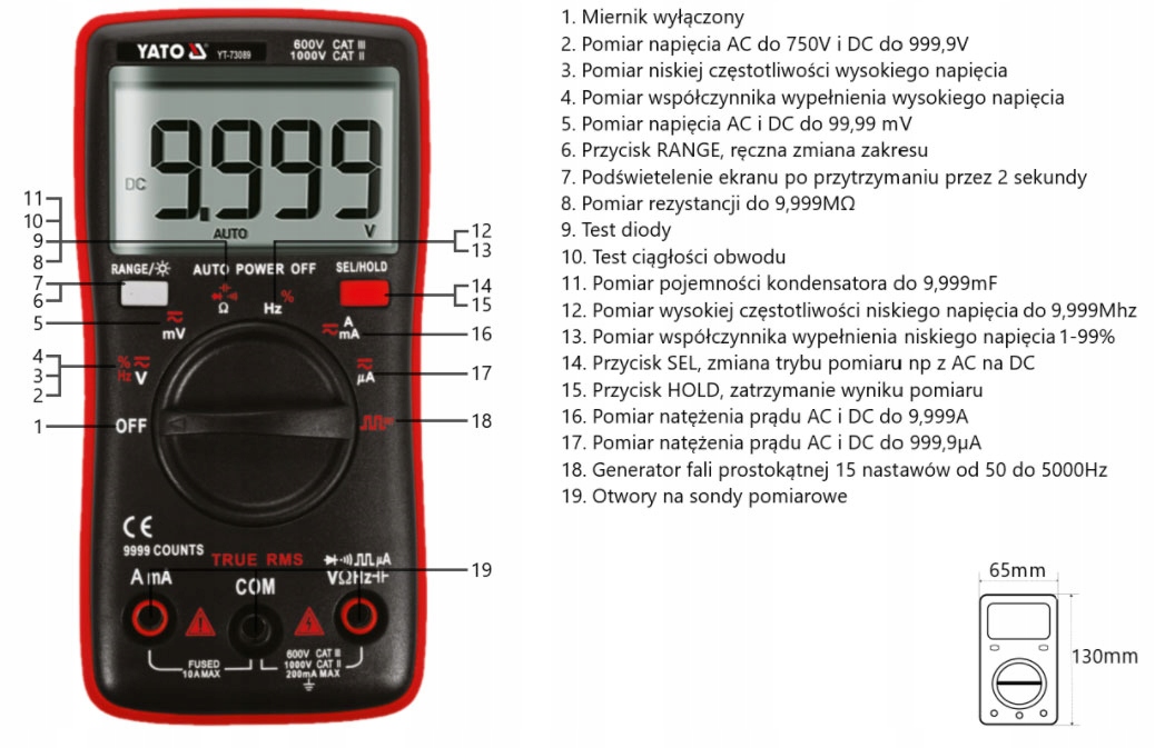 Універсальний лічильник від yato yt-73089 з справжньою функцією RMS дозволяє лічильнику відображати реальне ефективне значення напруги та інтенсивності змінного струму, який є ключовим в схемах імпульсних джерел електроенергії або інсталяції HVAC