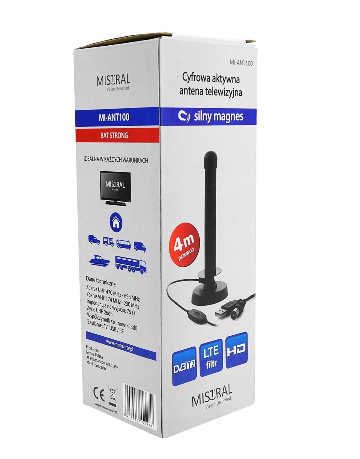 Антена марки Mistral ANT100 має магнітну ніжку з гумовою кришкою, яка запобігає подряпинам корпусу, даху, підвіконня тощо. поверхні. Це практичне рішення разом із 4-метровим кабелем робить антену дуже універсальною та готовою до використання практично в будь-яких умовах.