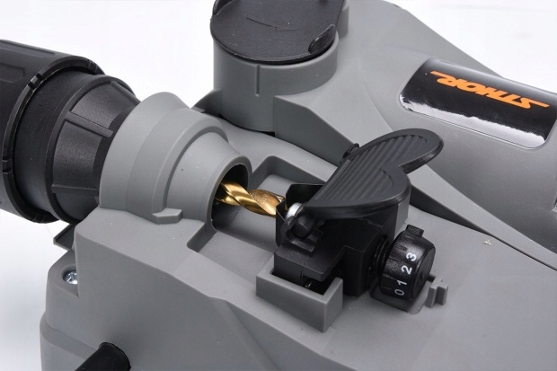 Перш ніж заточувати свердло, його необхідно належним чином закріпити в тримачі. Для цього натисніть на засувку, щоб відкрити їх (III). За допомогою ручки ручки встановіть діаметр трохи більше діаметра свердла, яке заточується, щоб забезпечити вільне переміщення свердла в ручці. Вставте тримач у гніздо позиціонування свердла (IV). Будь ласка, зверніть увагу, що тримач свердла має шліци, які слід вставити в пази гнізда (V). Підніміть фіксатор губки, щоб захопити свердло, поверніть свердло так, щоб воно було схоплено в найвужчому місці (VI).