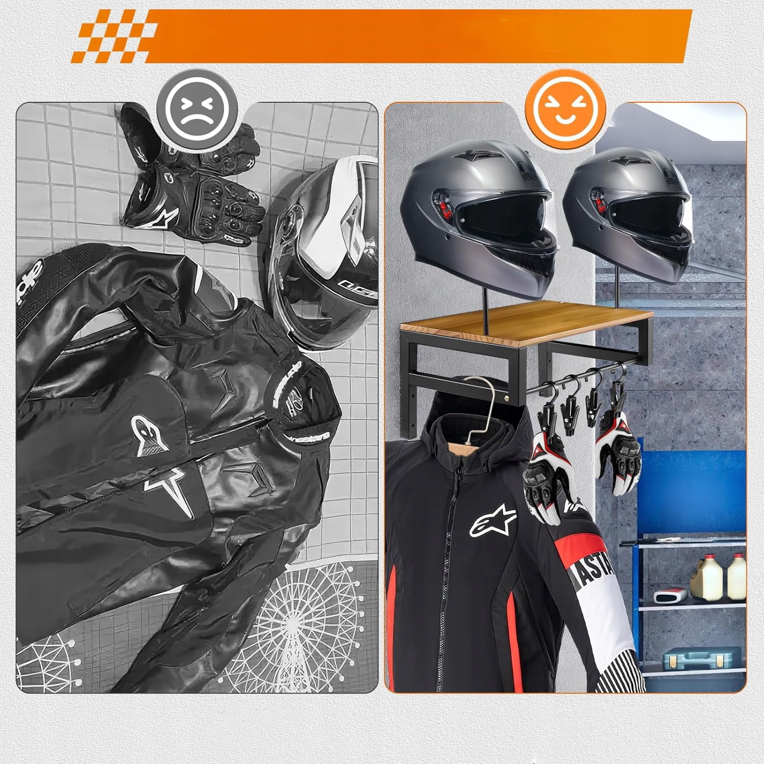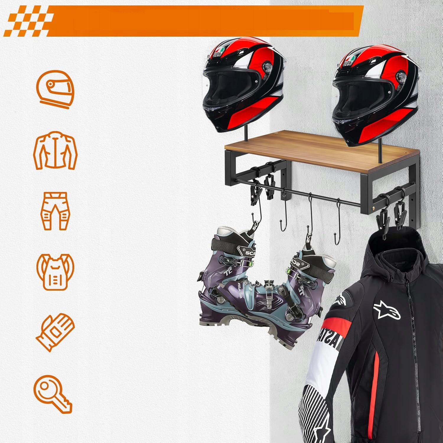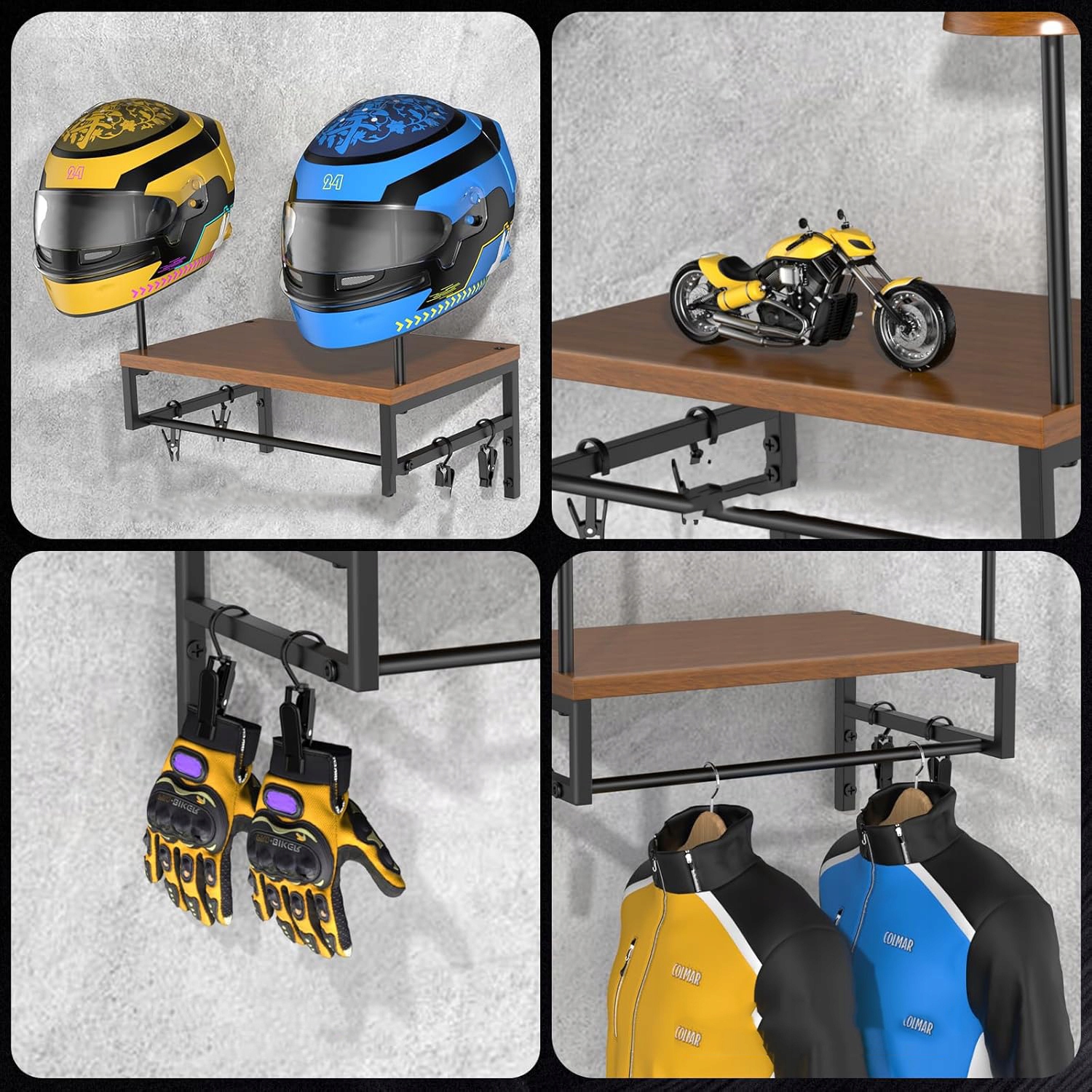 🌋- Підставка поставляється з 2 опорними дужками, 4 затискачами та 4 гачками, які можна використовувати для зберігання мотоциклетних шоломів, бейсбольних шоломів, ковбойських капелюхів, курток, пальто, рукавичок та більше.