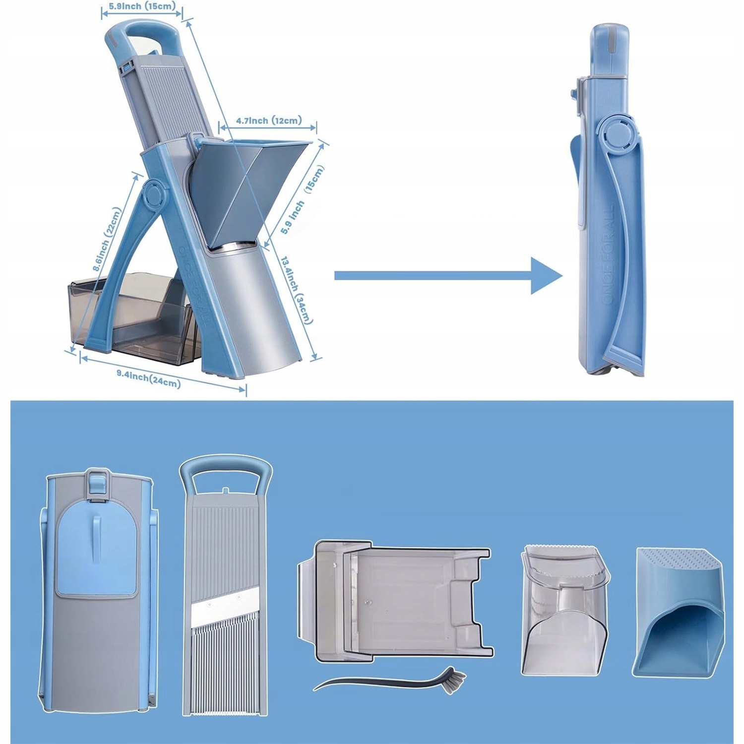 🫑🫑ЛЕГКО ЧИСТИТИ: ця кухонна мандоліна складна та компактна, має розміри 34X24X15 см, займає менше місця в шафі, ніж картоплерізка, щітка, що входить у комплект, легко видаляє залишки на лезі, а контейнер для їжі забезпечує чистоту вашої стільниці. Це ідеальний подарунок на День подяки, Різдво та Хелловін.