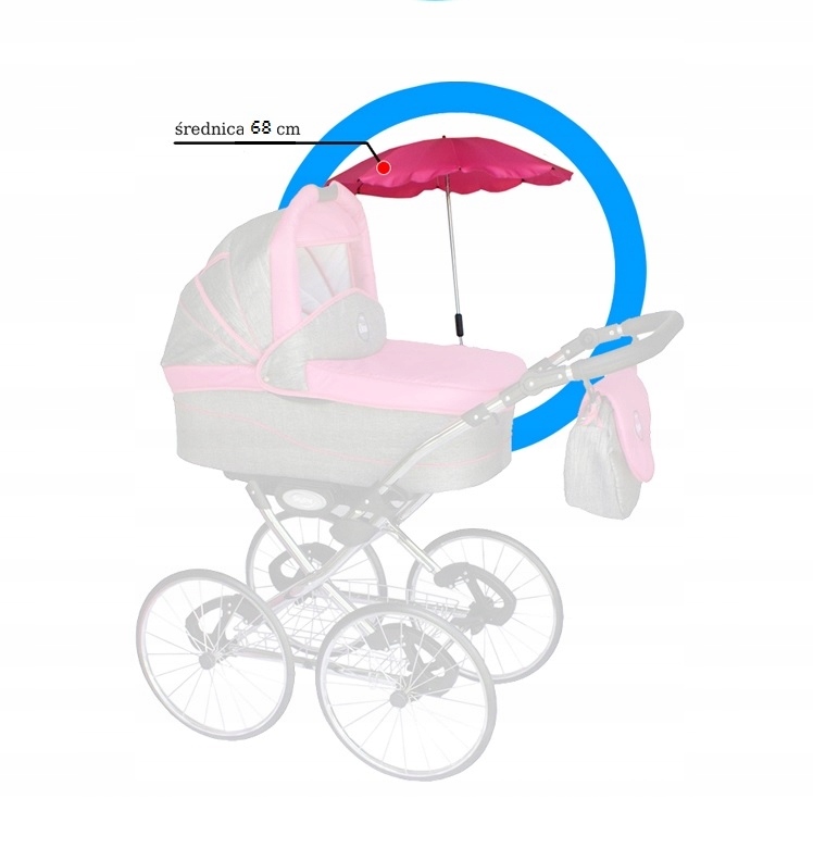 Парасолька виготовлена з тканини найвищої якості, стійкої до змін погодних умов. Необхідний аксесуар для кожної коляски та коляски. Завдяки металевій трубі, оснащеній міцною пружиною, парасолька може замінити дощовик, ефективно захищаючи дитину від дощу і особливо від шкідливого УФ-випромінювання. Міцно виготовлений, круглої форми. Усі гострі наконечники ретельно закриті, щоб запобігти випадковому травмуванню дитини.