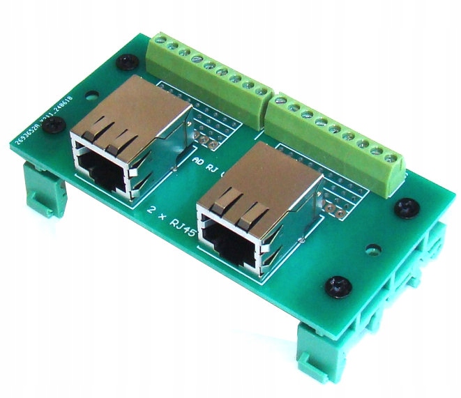 Універсальна плата з двома розетками RJ45, встановленими на DIN-рейку.