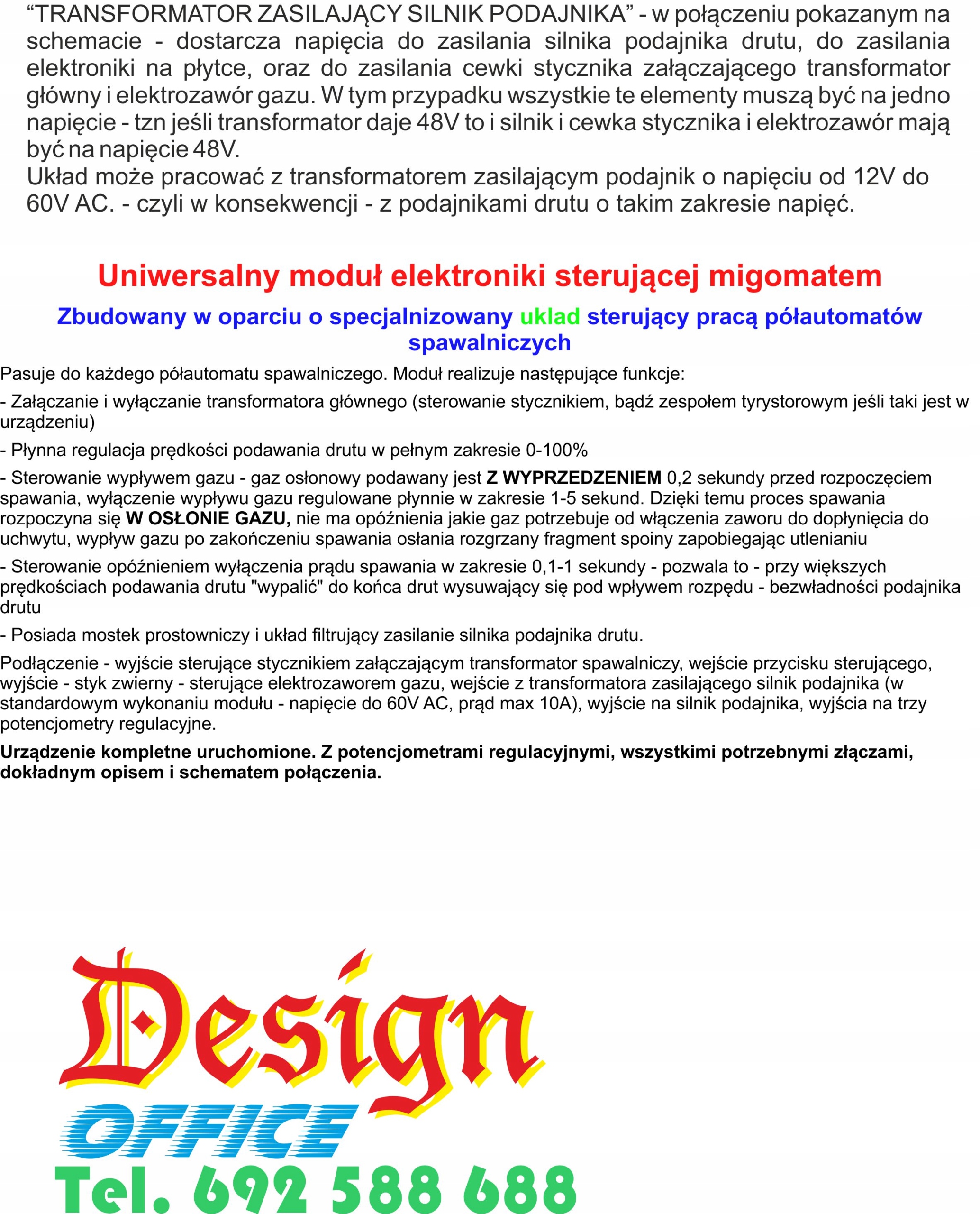Встановлюється на будь-який зварювальний напівавтомат із класичним трансформатором. Даний модуль відрізняється від інших модулів мігомат нашого виробництва тим, що не потребує живлення 230В. Завдяки цьому його можна використовувати, наприклад, у зовнішньому механізмі подачі дроту, до якого зазвичай не подається мережева напруга, і тому використання класичних систем, що потребують живлення 230 В, є складним або неможливим. Стандартний варіант системи розрахований на роботу з фідером, в якому двигун живиться напругою від 12В до 60В, а трансформатор, що живить двигун, повинен мати таку ж напругу. У стандартній версії система може працювати з максимальним струмом двигуна 10A.