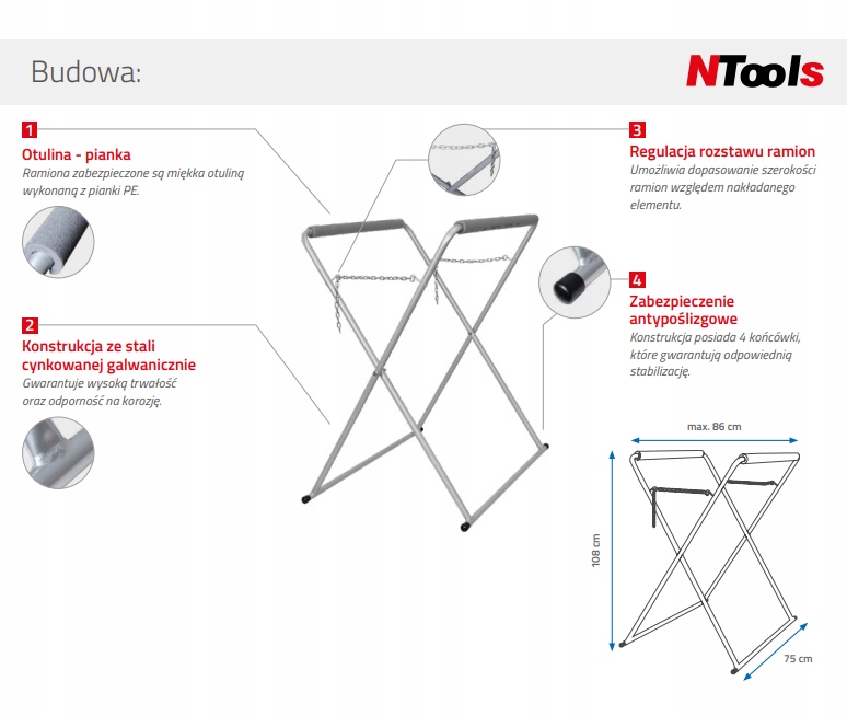 Виготовлена із сталевої труби з порошковим покриттям та оцинкованої сталі. Має накладки з м'якого пінополіетилену, що полегшує розташування та стабілізацію дуже делікатних елементів, наприклад, скла.