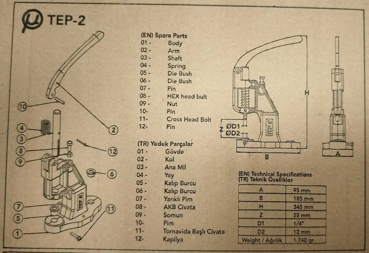 Прес ТЕР-2 – це ручний механічний інструмент, призначений для складання різних видів металевих елементів, таких як ґудзики, люверси, заклепки, кнопки, джинсові ґудзики та для пришивання ґудзиків. Використовується в пошитті для точного і надійного кріплення елементів на тканинах та інших матеріалах.