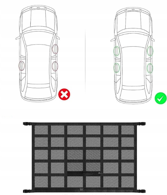 - Широка сумісність: Сітка відповідає більшості транспортних засобів з чотирьох ручок на стелі. Не сумісний з автомобілями лише з трьома ручками.