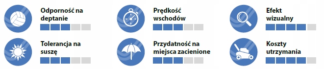 Сучасна суміш насіння створює газон, який не тільки чудово виглядає та має репрезентативні цінності, але й зберігає чудові параметри стійкості до витоптування та використання. Щільне коріння зміцнює ґрунт і надає йому виняткової стійкості та довговічності.