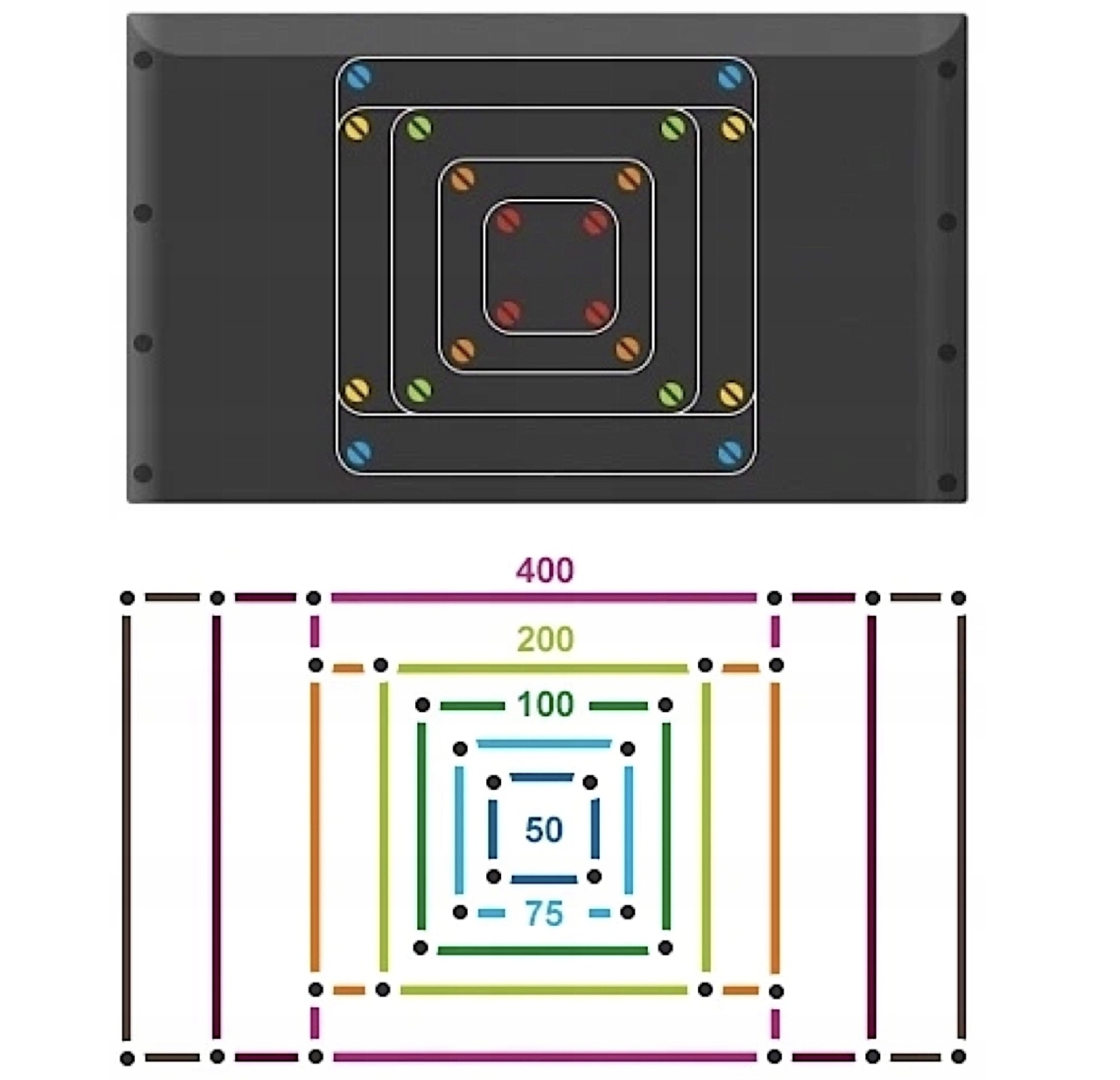 ☀️Стандарт VESA: VESA-сумісні отвори від 200x100 мм до 600x400 мм.
