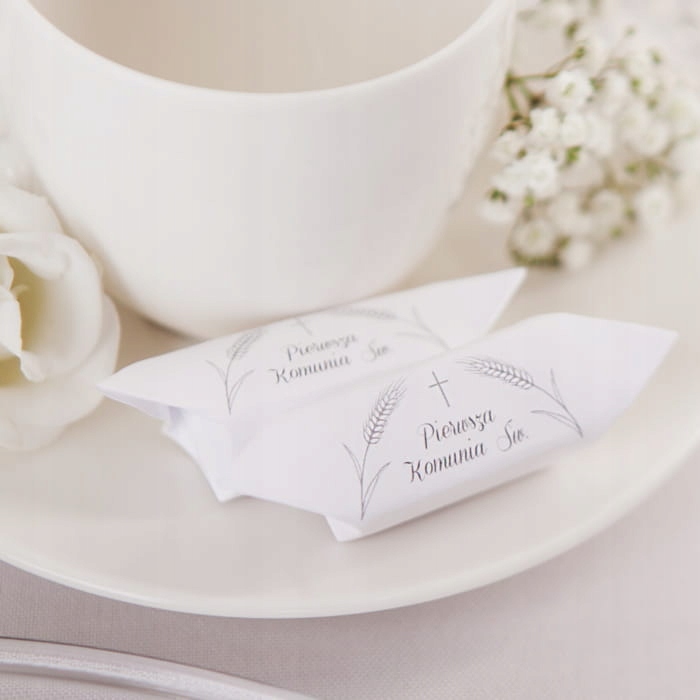 Фаджі з ніжним смаком і красивою індивідуальною упаковкою є вдячним жестом подяки. Ці оксамитові закуски з папером із мотивом срібного колоса та написом «Перше Святе Причастя» чудово пасують до декору столу.