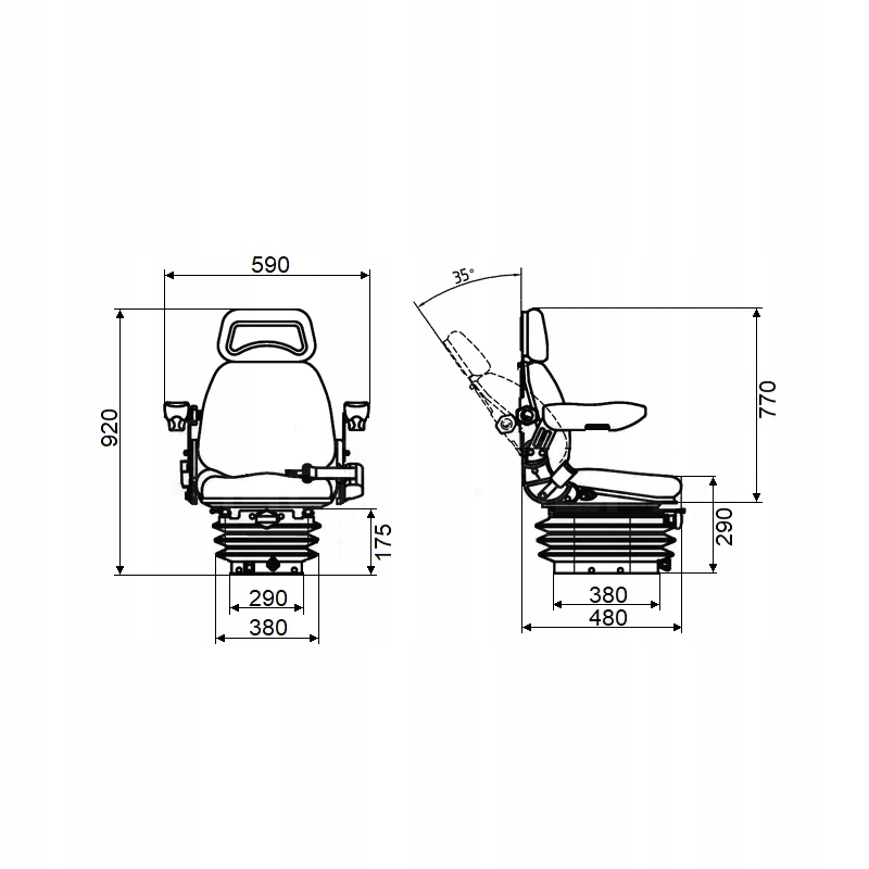 Універсальне сидіння з підлокітниками для тракторів, візків, сільськогосподарських і промислових машин. Підходить, зокрема, до тракторів Ursus, Zetor та подібних. Сидіння механічно підвішене з регульованою вантажопідйомністю до 130 кг.