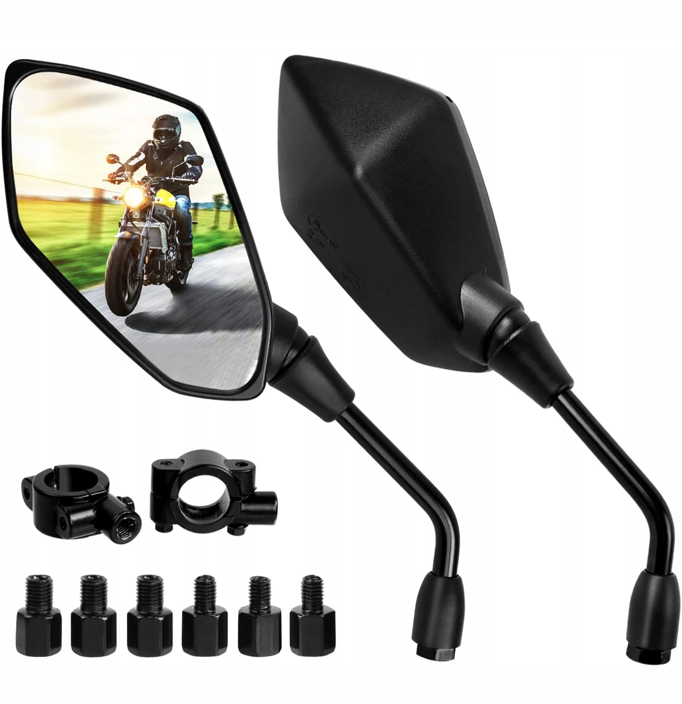 🏍 【Повні аксесуари】 Пара містить 2 дзеркала (1x правий + 1x ліворуч), вона доставляється 6 гвинтами, 3 на 10 мм, 3 на 8 мм і 2 22 мм затискачів. Широкий асортимент аксесуарів для легкої установки. Примітка. Перед покупкою переконайтеся, що нитка та розмір бази продукту сумісні з моделлю вашого автомобіля!