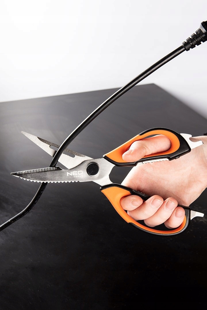 Ножиці 230 мм 6 в 1, 64-001 NEO це ножиці довжиною 230 мм і 6 функцій в одному інструменті. Вони мають практичну двокомпонентну ручку та корпус, який можна розділити на дві частини. Їх можна використовувати як лускунчик, відкривач для пляшок, відкривач для ящиків, скребок і очищувач. Їх можна використовувати вдома, в гаражі або в майстерні. Висока міцність ножиць NEO забезпечить довгі роки використання.