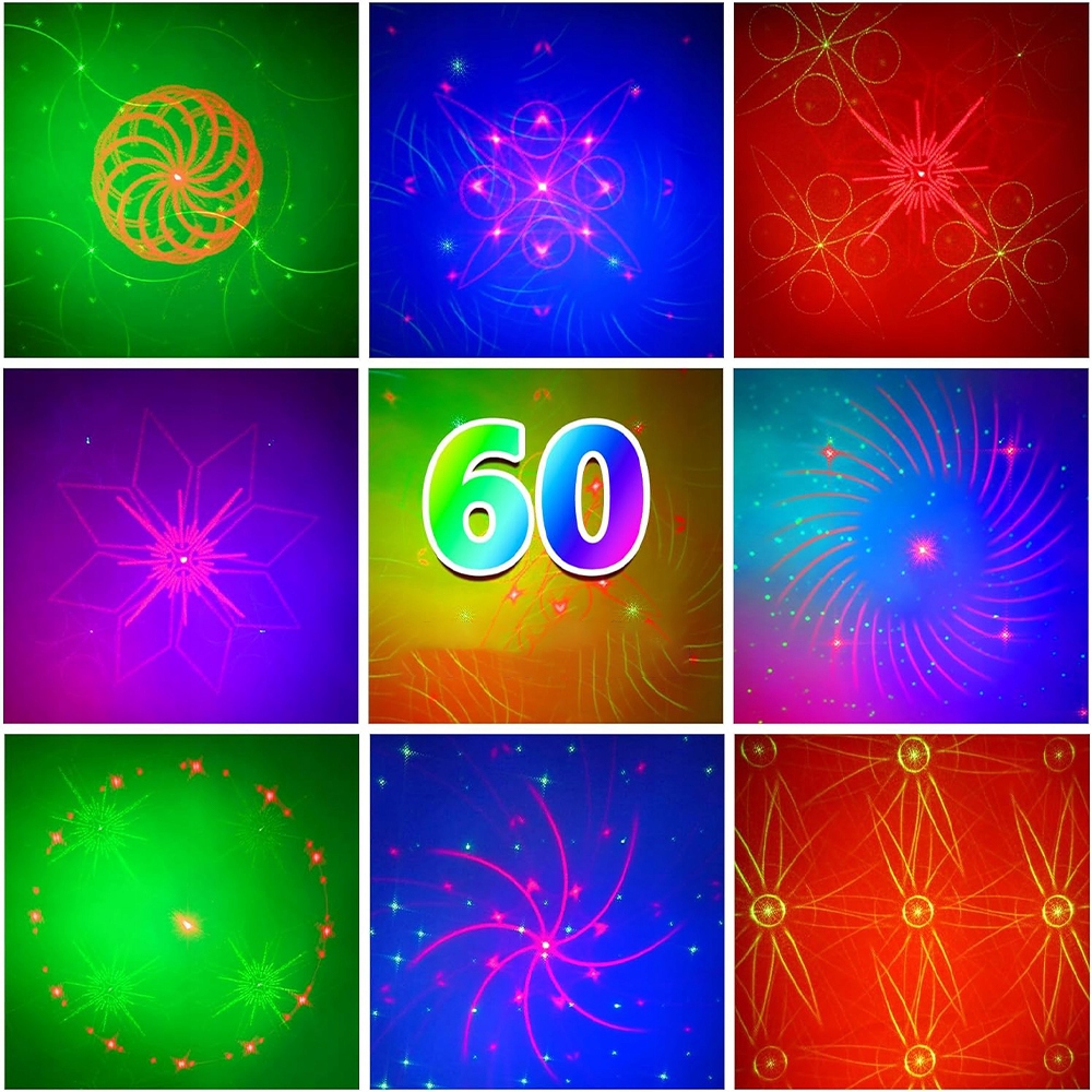 Основні світильники диско -кулі червоні та зелені, а світлодіоди червоні, зелені та сині. Він пропонує 60 різних конструкцій та 9 режимів роботи (автоматичний режим 1/2/3, режим спалаху 1/2/3, музичний режим 1/2/3). Різні комбінації можуть бути забезпечені за допомогою захоплюючих світлових показів