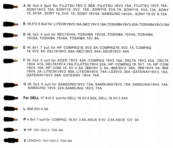 - Тип F: 5,5x2,5 мм - Acer, Compaq , Delta, Fujitsu, HP, IBM, Liteon