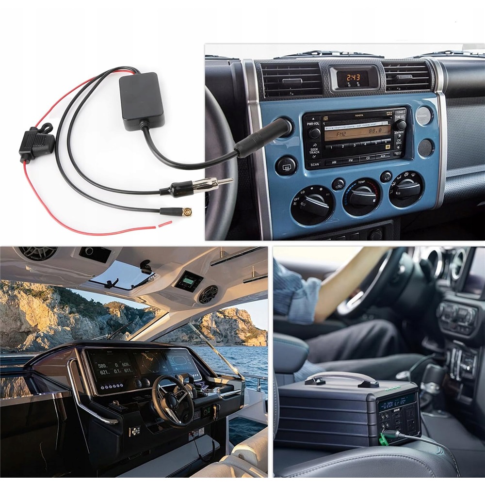 1 x підсилювач антени автомобіля. Сумнівно з більшості автомобілів з FM -розеткою та виводом DAB, такими як автомобілі, транспортні засоби, човни, вантажівки.