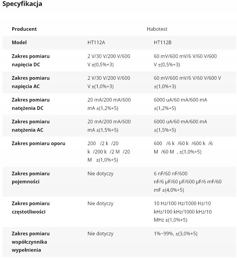 Мультиметр Habotest характеризується неймовірною точністю. Він точно вимірює, серед іншого, змінну та постійну напругу, опір і струм. Він також розпізнає активність кабелю. За допомогою нього ви можете перевірити діоди, перевірити безперервність і справжнє середньоквадратичне значення. Він також дозволяє безконтактне визначення напруги (NCV). HT112A також має функцію SMART, яка забезпечує інтелектуальне виявлення.