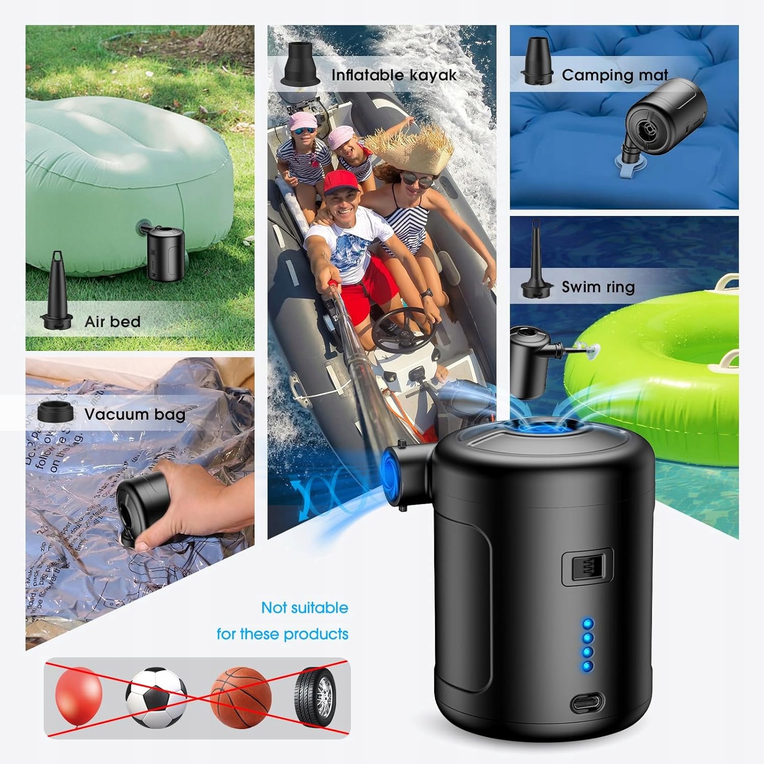 - 【5 Багатофункціональні форсунки】: Електричний повітряний насос оснащений 5 різними типами форсунок для задоволення різних потреб у полі насос. Ідеально підходить для кемпінгових матраців, понтонів, надувних басейнів, надувних матраців для плавання в басейні, басейни для дітей та інших надувних предметів. Він також може бути використаний для видалення зайвого повітря з вакуумних мішків.