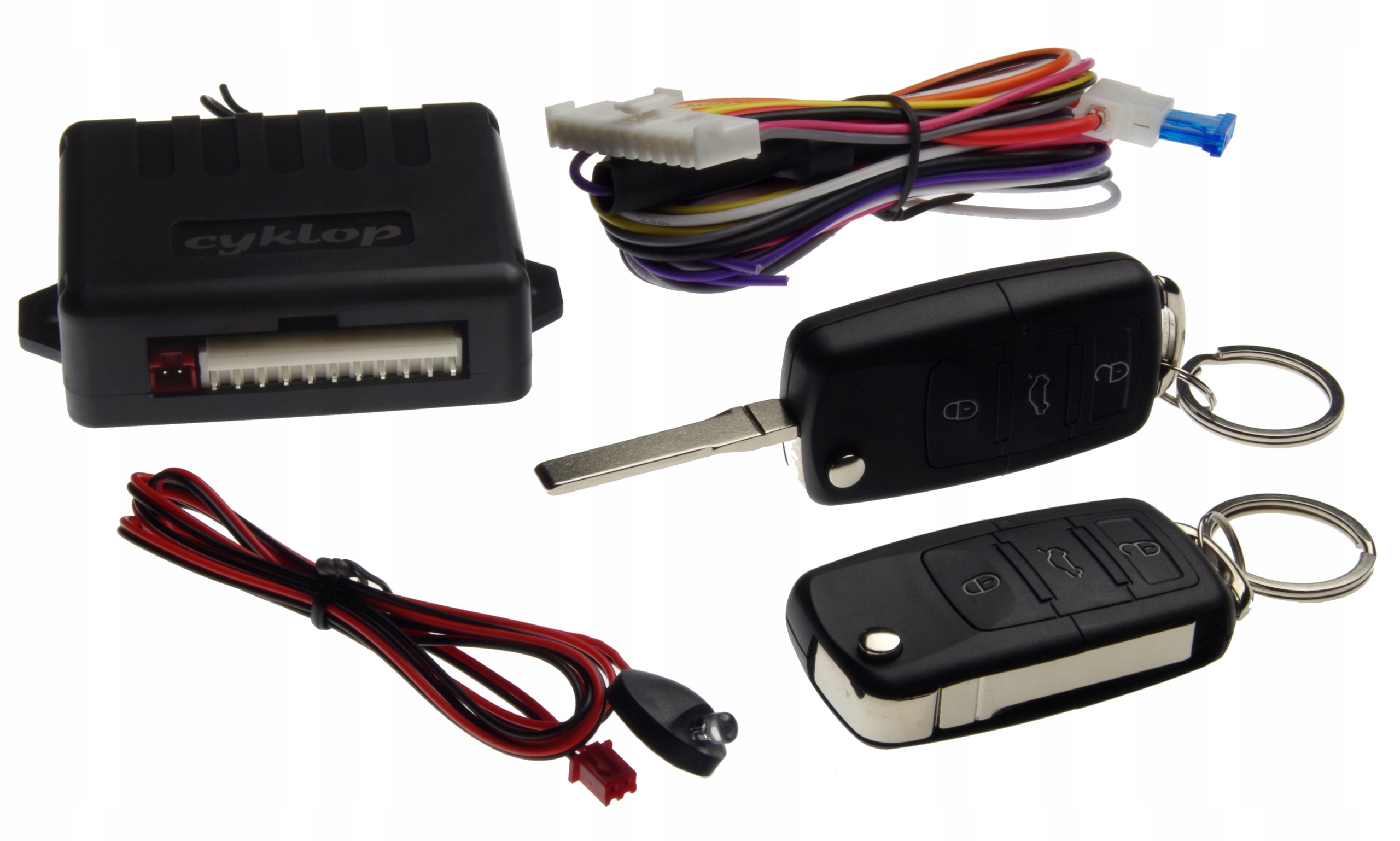 Управління пристроєм здійснюється за допомогою 2 пультів дистанційного керування з червоними світлодіодами. Має світлодіодний діод (синього кольору), що сигналізує про зачинене авто (імітація включення сигналізації). Має вихід для управління поворотниками. Підходить до будь-якого автомобіля, оснащеного як оригінальним заводським замком (електричним і пневматичним), так і додатковим універсальним замком. Пристрій оснащений 4 сильноточними реле, які дозволяють контролювати будь-яку обрану конфігурацію. Ми можемо керувати центральним замком, який спрацьовує масою, плюсом, чергуванням маси та плюса, а також безпосередньо приводами в дверях. Контролер можна безпосередньо підключити до актуатора, що відкриває кришку багажника (імпульс +12В, 10А). Cyklop C-2 також має вихід для закриття вікон (маса 150 мА протягом 25 секунд після ввімкнення) і працює безпосередньо у всій групі VW (Audi, VW, Seat, Skoda) та в інших автомобілях, обладнаних заводським масовим контролем. Система комфорту. Контролер також має функцію - локація автомобіля, після натискання на пульті - покажчики поворотів блимають протягом 30 секунд.