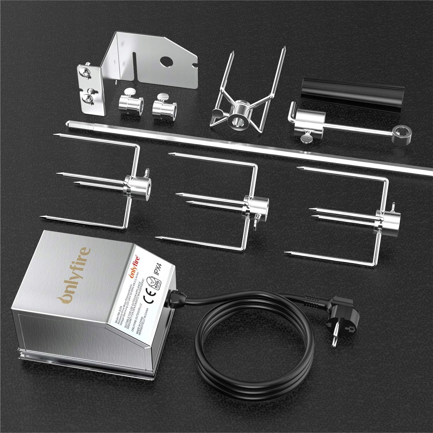Барбаличні болти лише з шпинделем, двигуном, ручкою двигуна, чотирма голками, ручкою та регулюванням ваги. Набір поворотних коток можна встановити за низькими витратами. Цей гриль має універсальне використання і підходить до багатьох барбекю, грилів, жарових та багатьох інших. Комплект включає шампури, двигун, м'ясну машину, чотири голки, ручку, баланс ваги підходить до багатьох грилів, гриль, копалень та багатьох інших. Зовнішній діаметр: 10,5 мм ширина (внутрішній діаметр: 9 мм шип