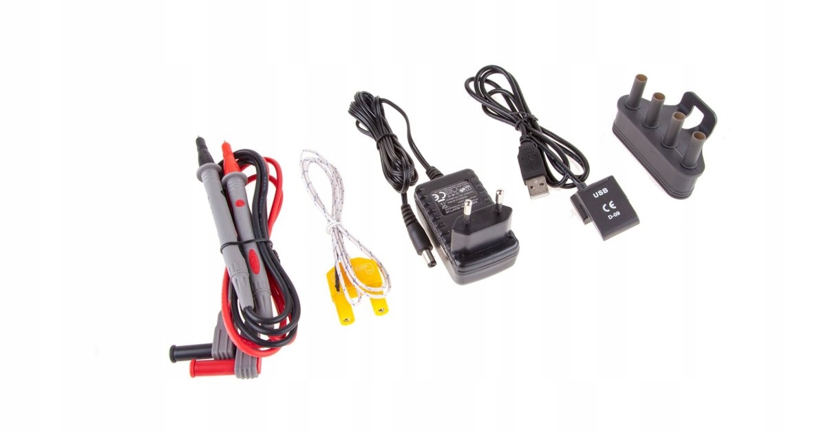 - Аксесуари: вимірювання кабелів, зонд вимірювання температури, кабель USB, зарядне пристрої, розетка зарядки, CD, корпус