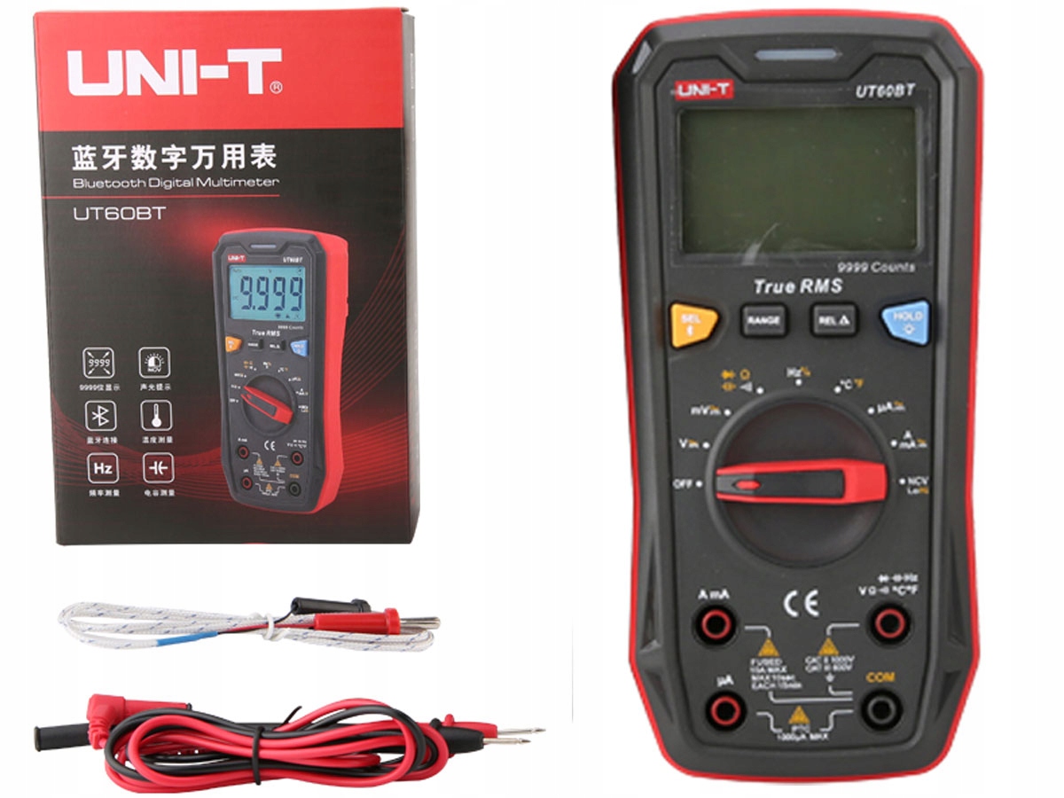 Лічильник UNI-T UT60BT із функцією Bluetooth — це портативний глюкометр, оснащений РК-дисплеєм. На додаток до можливості вимірювання основних електричних величин, таких як напруга постійного або змінного струму, постійний або змінний струм або опір (у дуже зручних діапазонах вимірювання). Вони також дозволяють вимірювати ємність, температуру та частоту. Крім того, цей лічильник оснащено спеціальними функціями, такими як: NCV (функція виявлення електричного поля), режим REL, тобто нульове зчитування та справжнє RMS.