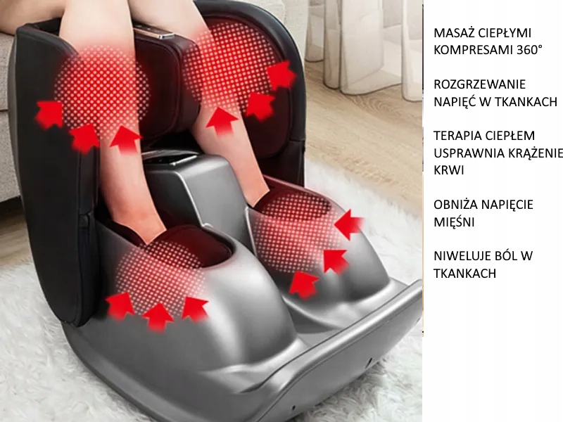 - Масаж, який знімає біль у стопах. Вібраційний масаж і теплотерапія створюють потік у нижній частині тіла та знімають напругу навколо колін. Це забезпечує кращий кровообіг, швидку регенерацію втомлених ніг і регенерацію м'язів після тривалого стояння або ходьби/інтенсивних вправ. Забезпечує глибоко проникаючий масаж стоп для оптимального розслаблення та негайного полегшення болю.