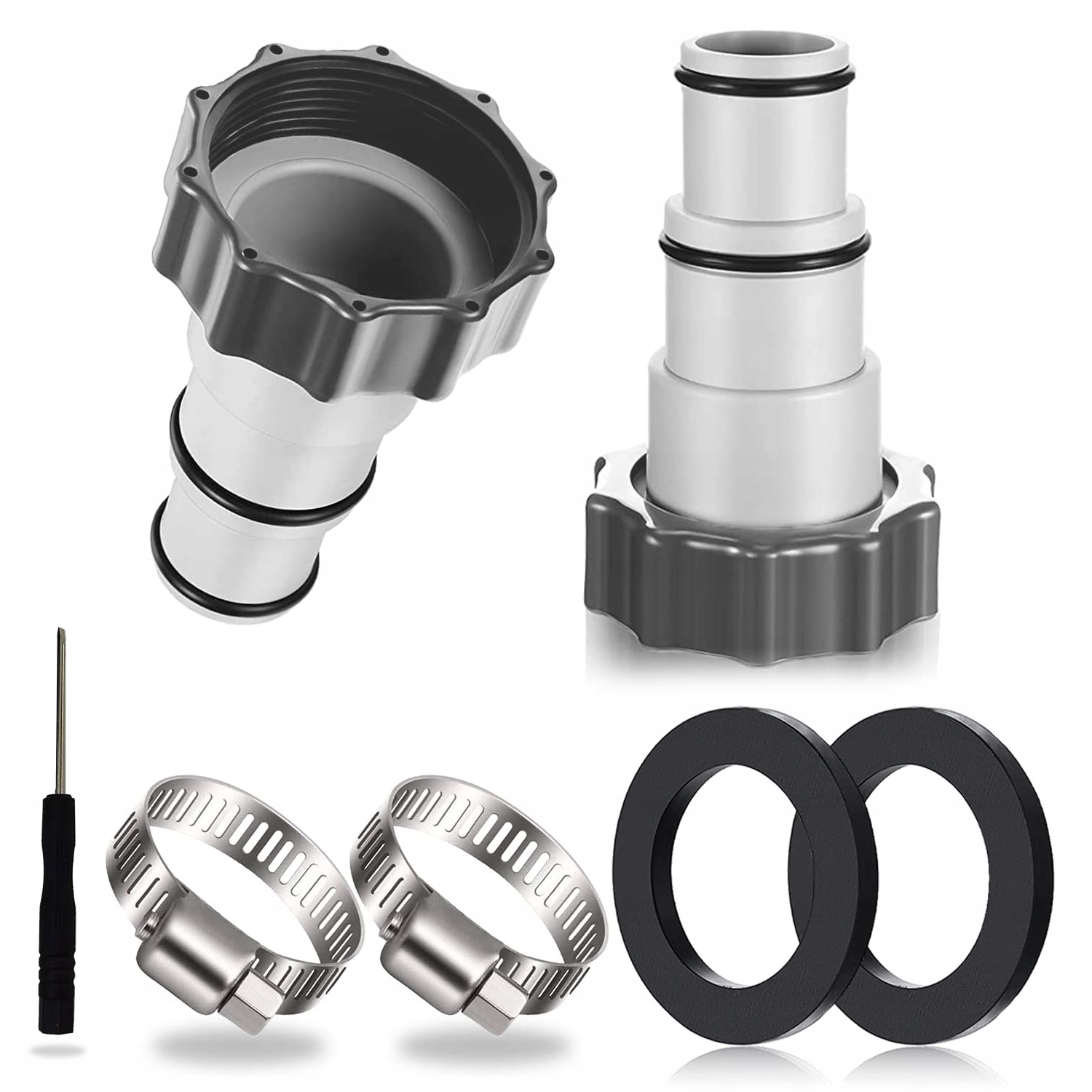 🧑🔧З’єднувач шланга насоса підходить для шлангів систем фільтрації, занурювальних насосів, насосів для басейнів, фільтруючих насосів, систем піщаних фільтрів або запірних клапанів. Рекомендується уникати використання хомутів на з’єднанні між водопровідною трубою та випуском.