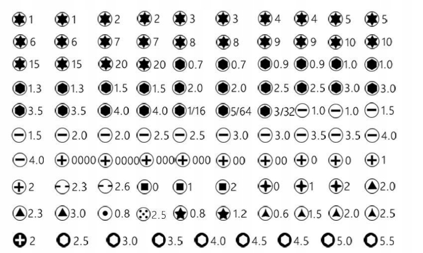 - ✅12 насадок Phillips: 2x PH0000, 2x PH000, 2x PH00, 2x PH0, 2x PH1, 2x PH2