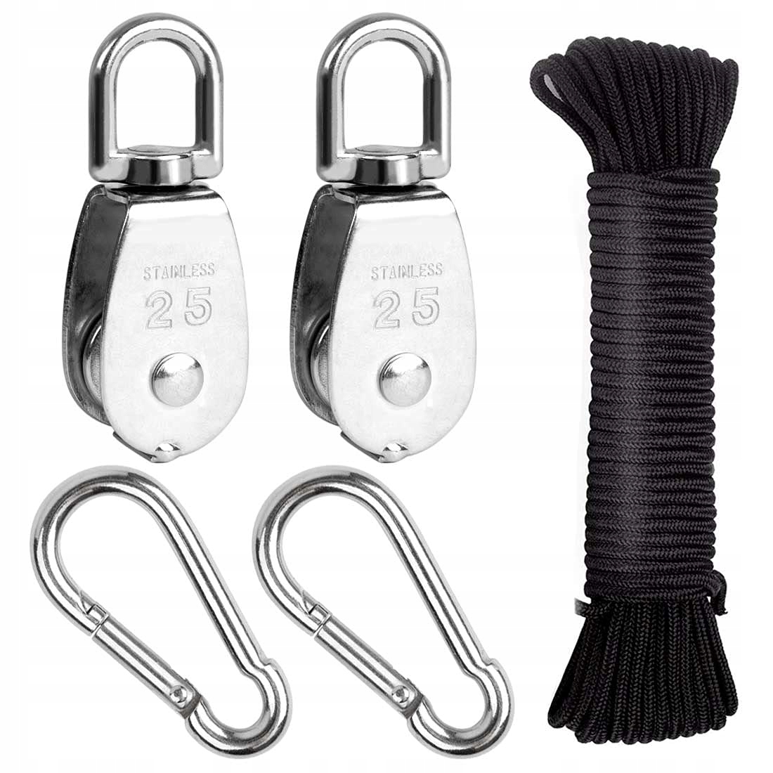 Один шків M25, максимальне навантаження: 150 кг, нейлонова мотузка, максимальне навантаження: 150 кг, пружинний карабін, максимальне навантаження: 150 кг.