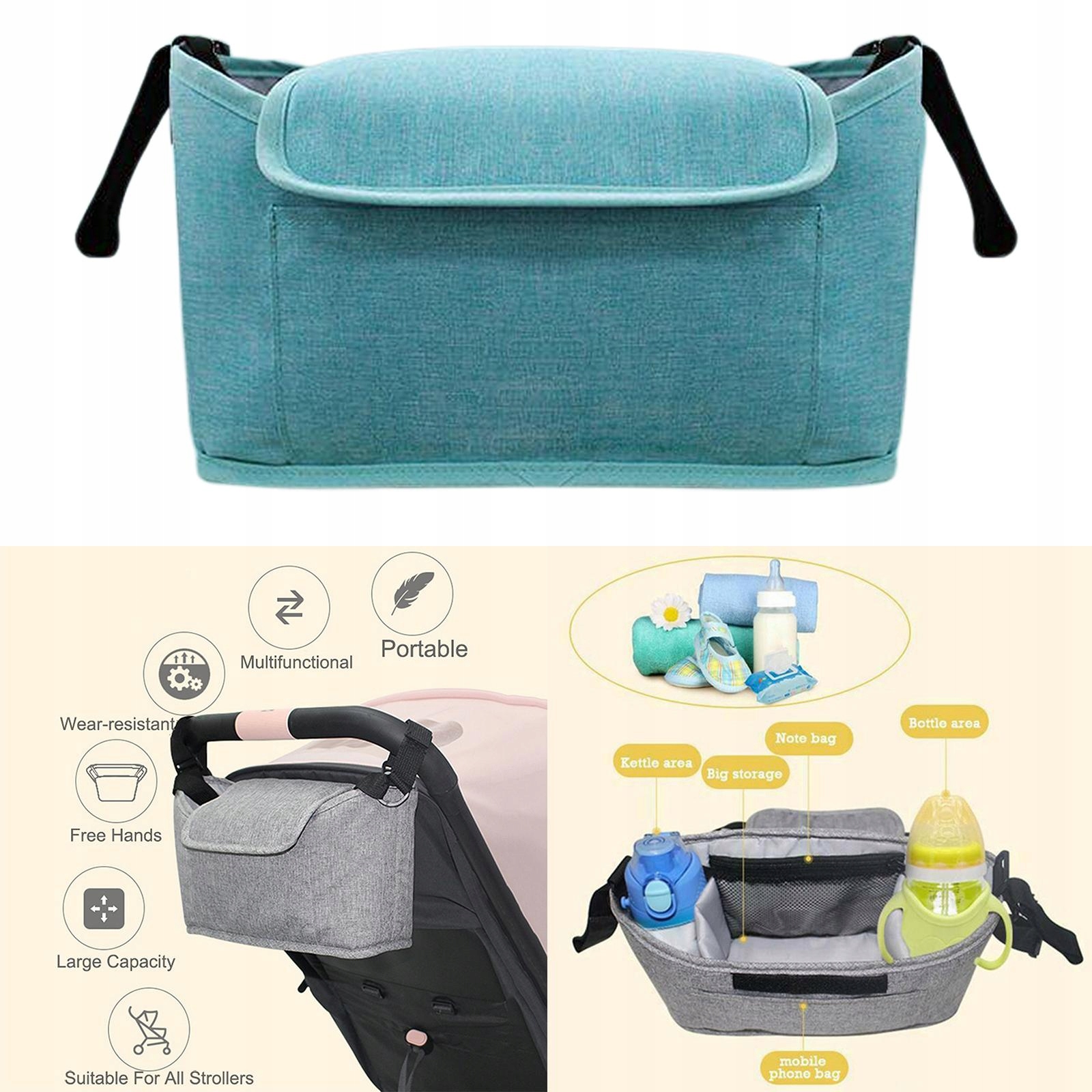 Велика місткість, з 2 тримачами для пляшечок для дитячих пляшечок або чашок, сітчасте зберігання кишеня для дитячих паперових рушників, велика площа для підгузків, їжі, бічна кишеня для мобільного телефону