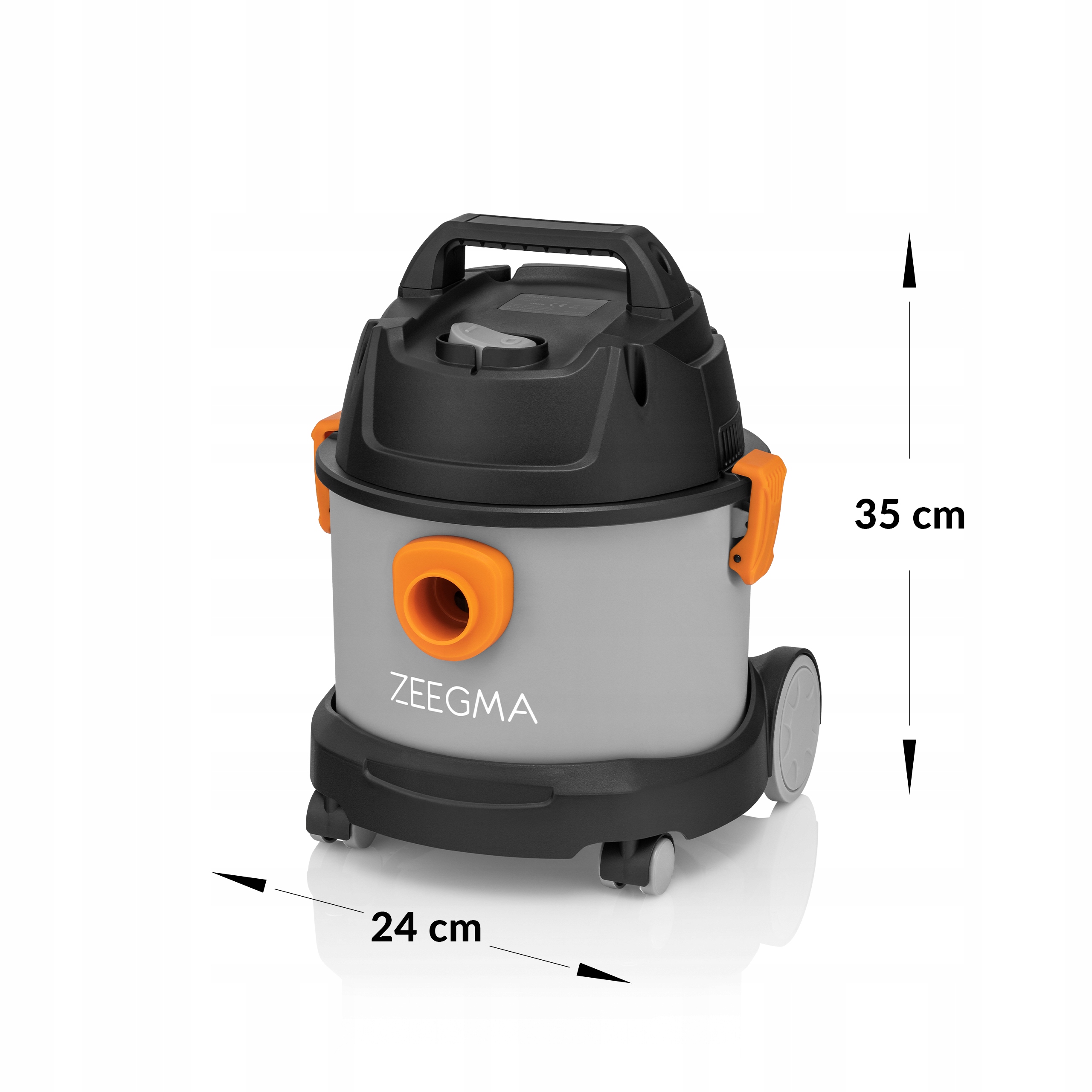 Промисловий пилосос Zeegma Zonder Pro Compact оснащений функцією DRY&WET, яка дозволяє збирати воду з очищені поверхні. Маленька насадка підходить для оббивки, крісел і оббивки, а велика - для килимів і пледів.