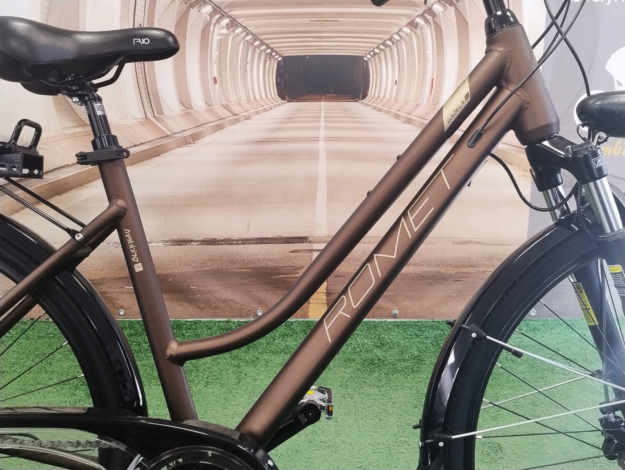 рамка, виготовлена з легкої ваги, і в той же час міцний алюміній має зменшене перехрестя, що полегшує сідати та ковзати вниз - особливість, особливо цінується в міському русі або під час руху з пані. Стильний, матовий коричневий колір надає велосипеду сучасний і елегантний вигляд, який виділяється з інших моделей.