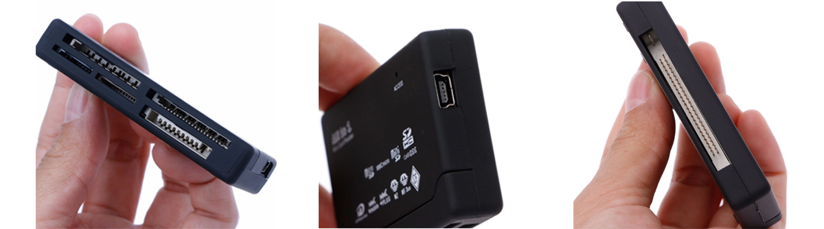 - USB-зчитувач надзвичайно малий і сумісний із картками microSD (включаючи microSDHC), SD , SDHC SDXC і TF, CF, RS-MMC, MMCmobile, MMC Plus, MS Duo.